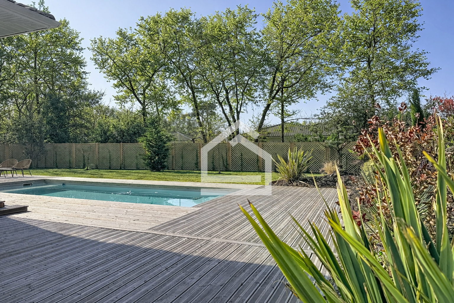 À l'extérieur, vous profiterez d'un magnifique jardin paysagé avec arrosage intégré, une piscine chauffée 9 x 3,5 m avec son volet immergé, bordée d'une superbe terrasse en bois de 110 m², idéale pour des moments de détente en toute intimité.