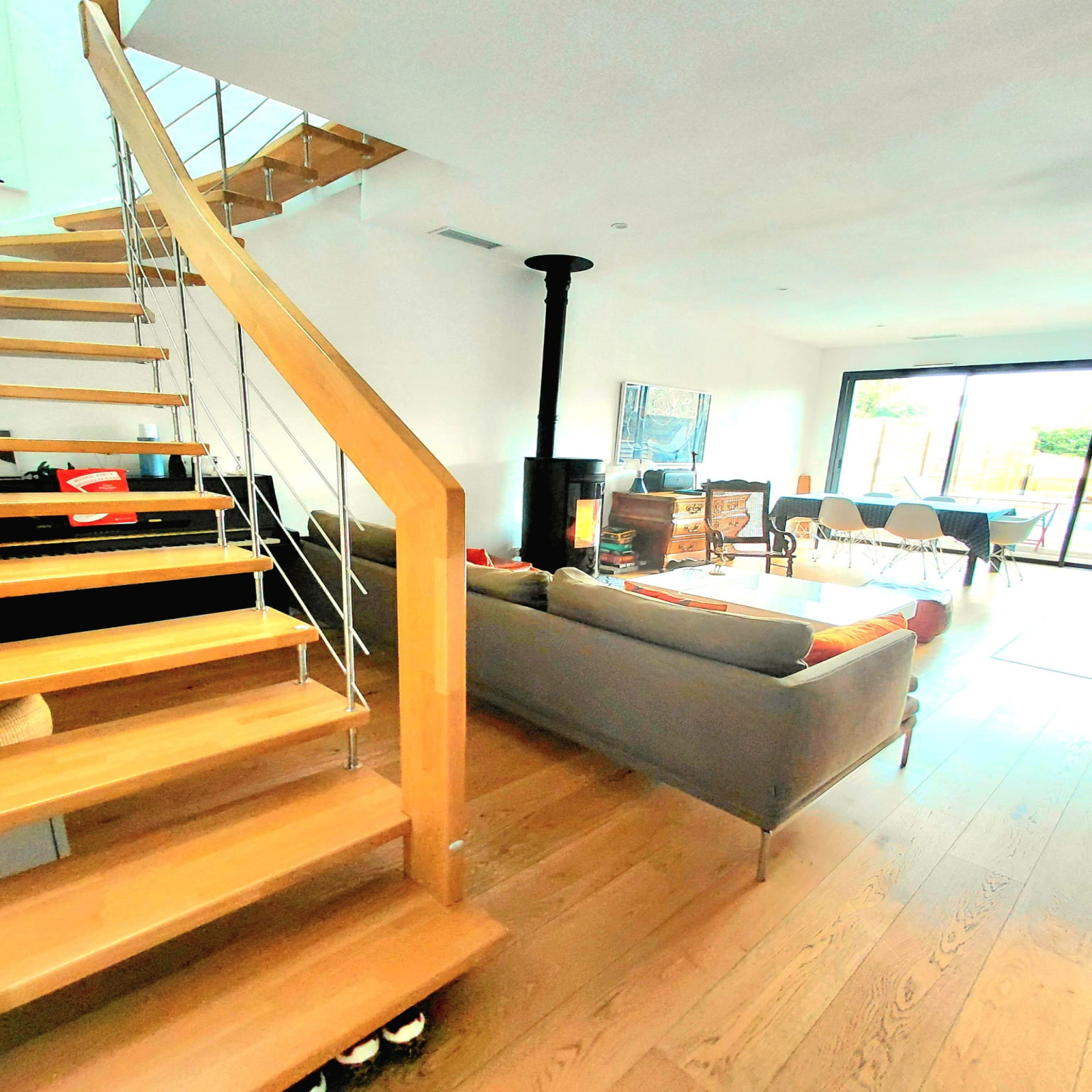 Dès l’entrée, le regard est naturellement attiré par la pièce de vie ouverte : salon, salle à manger, cuisine, bénéficiant d’une belle luminosité avec une large ouverture sur le jardin-terrasse et sa piscine.