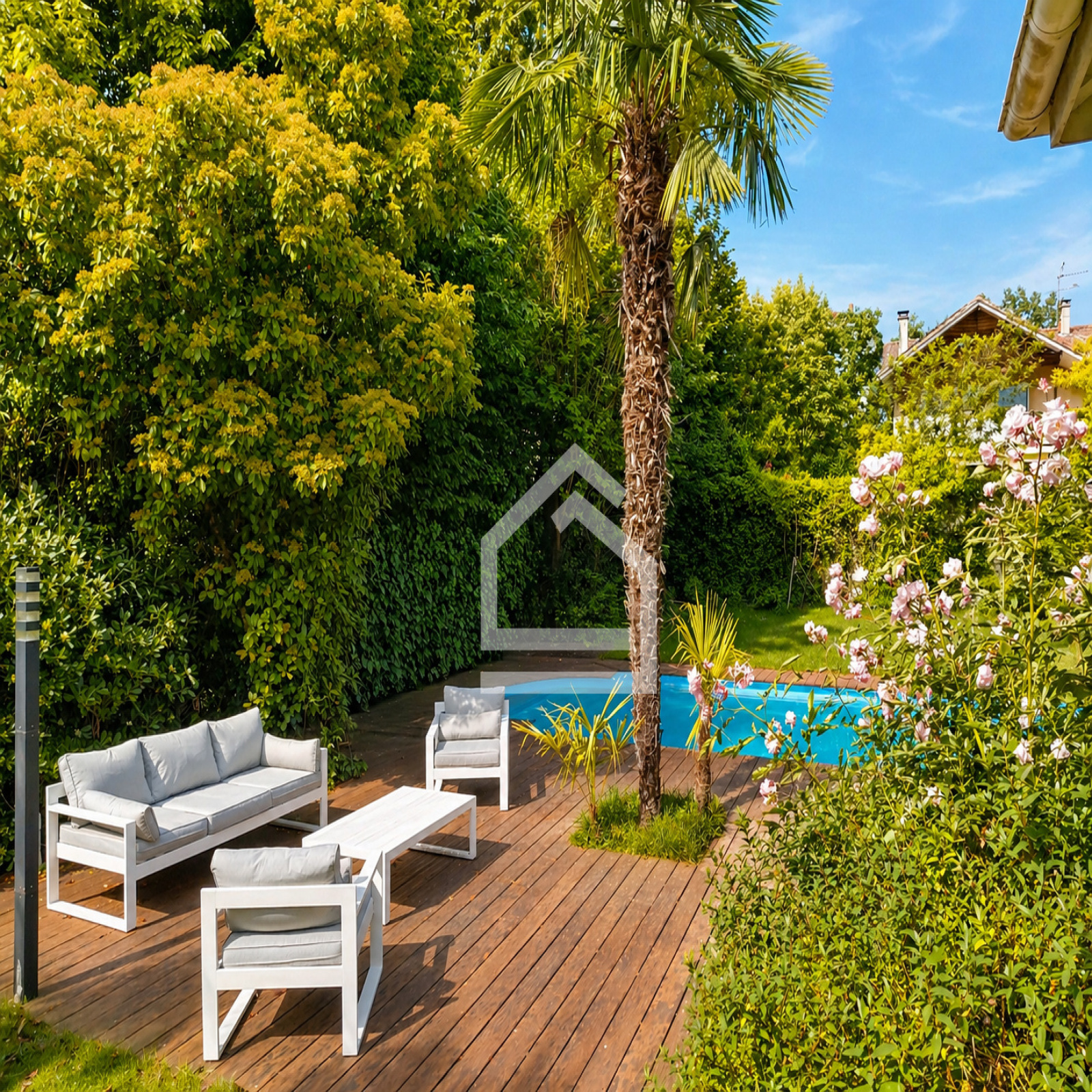 Le jardin arrière comprend 2 terrasses, une piscine de 9 x 4 m (chauffée par PAC et traitée par purification ozone), ainsi qu’une dépendance d’environ 20 m².
