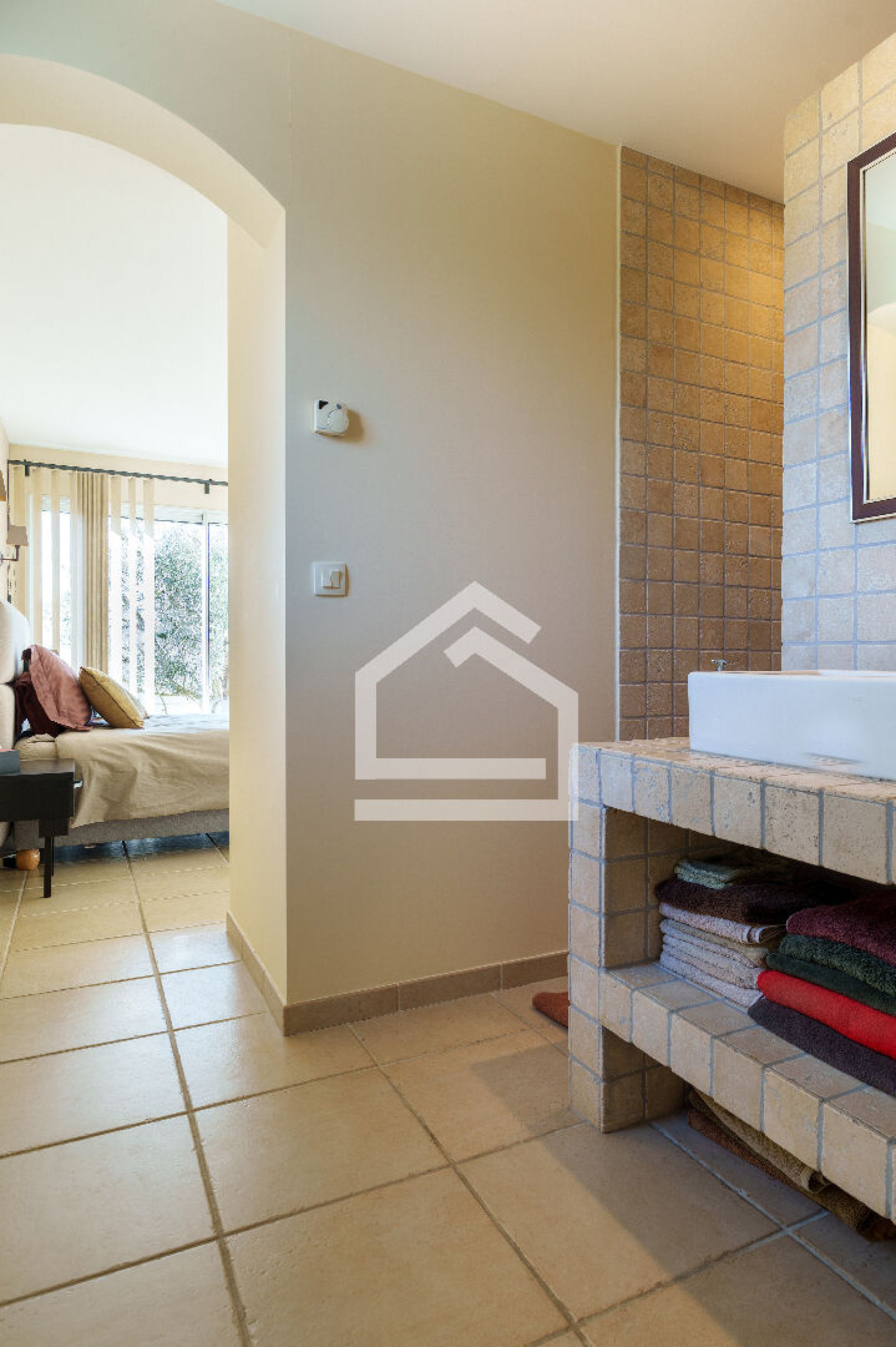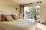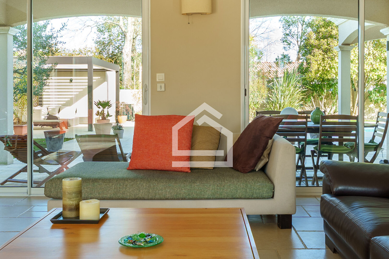 À l'extérieur, le terrain paysagé met en scène une magnifique piscine chauffée au sel de 11 × 5 m, sécurisée par un volet roulant immergé et accompagnée d'un espace détente sous pergola à lames orientables électriques.