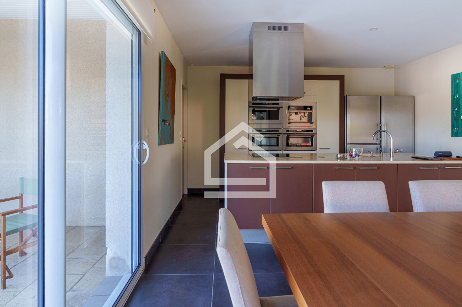 L'espace de vie, traversant et ouvert sur la grande terrasse et le jardin, offre un séjour aux belles proportions, associé à une grande cuisine entièrement aménagée et prolongée par les terrasses couvertes.