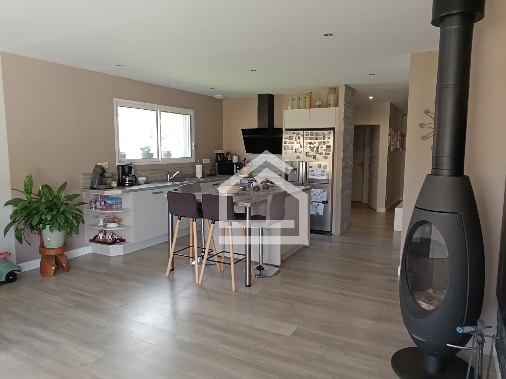 Dès l’entrée, la grande pièce de vie (56m2) séduit par sa luminosité et sa triple exposition sud/ouest. L’espace est chaleureux grâce au poêle à bois et agréable en toute saison grâce à la pompe à chaleur réversible. La cuisine ouverte, moderne et entièrement équipée, prolonge cet espace convivial pensé pour recevoir et partager.