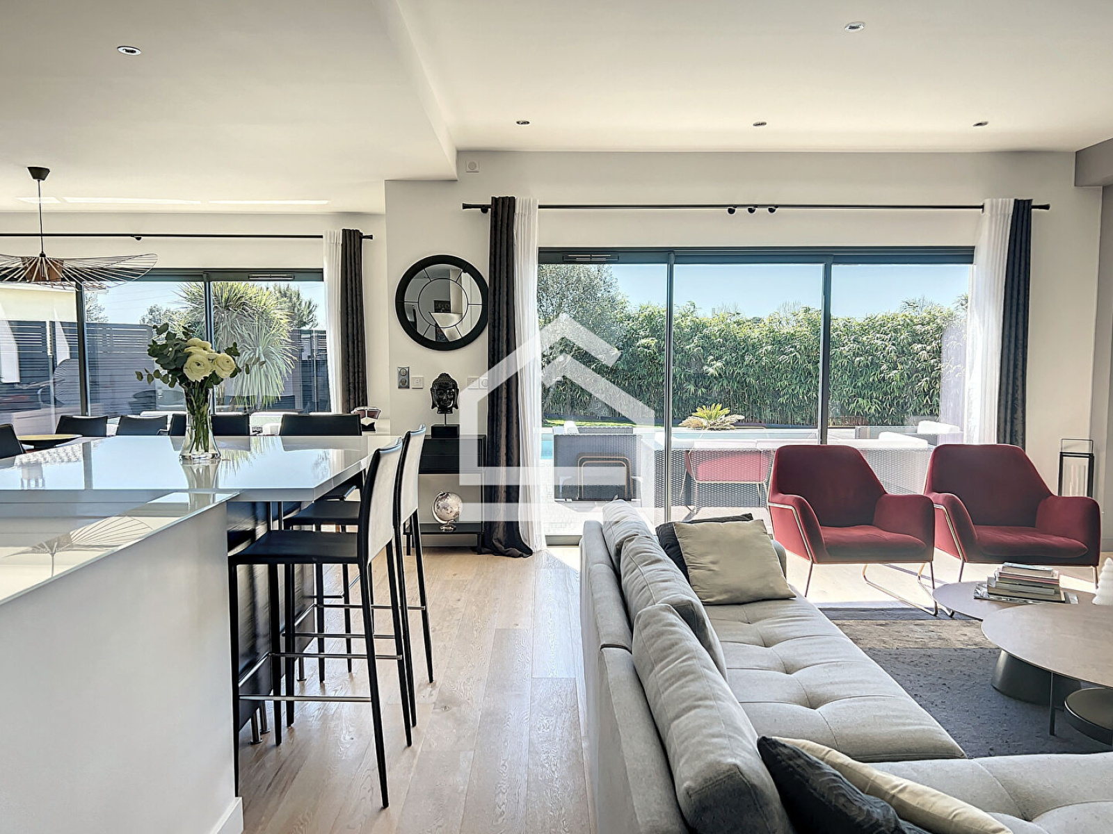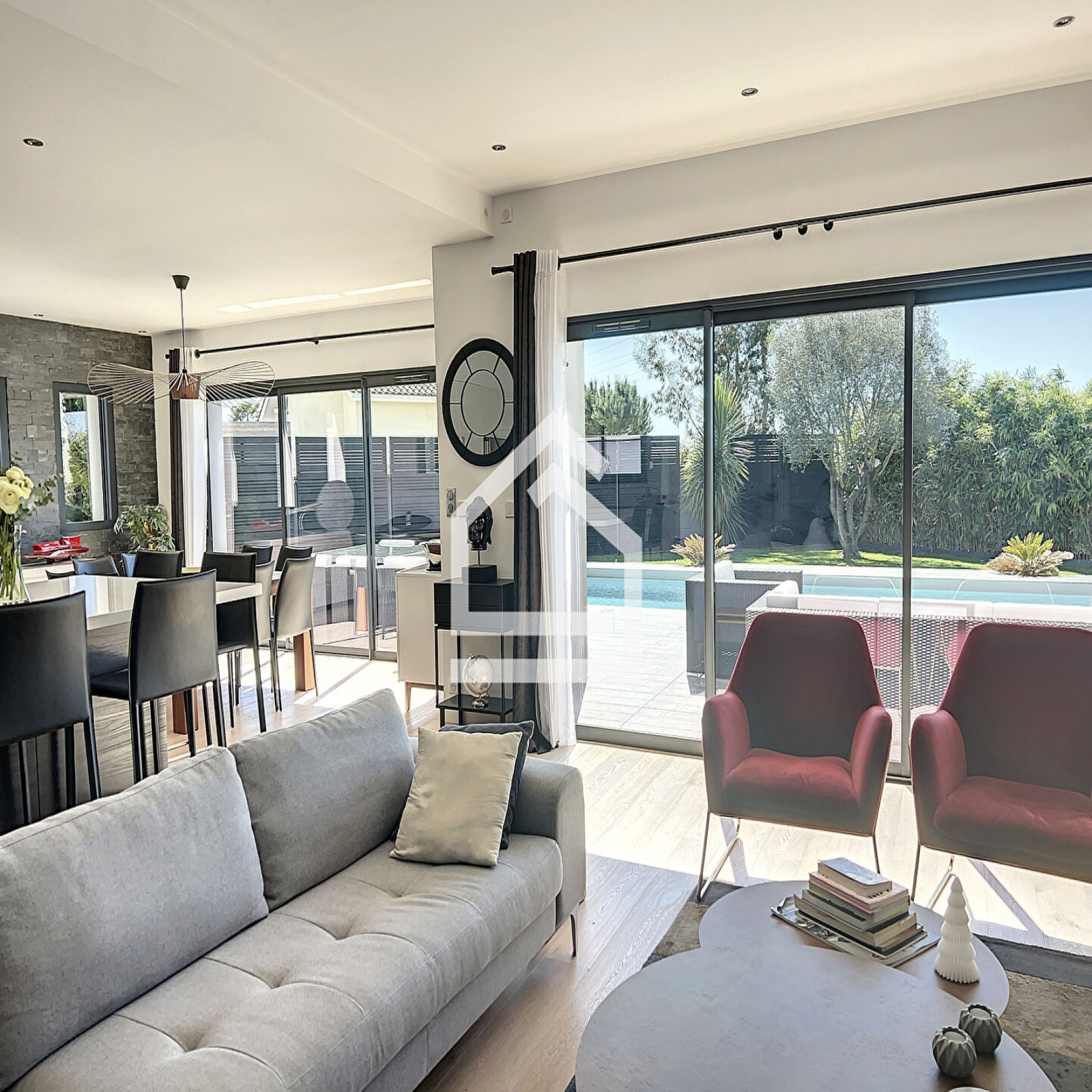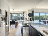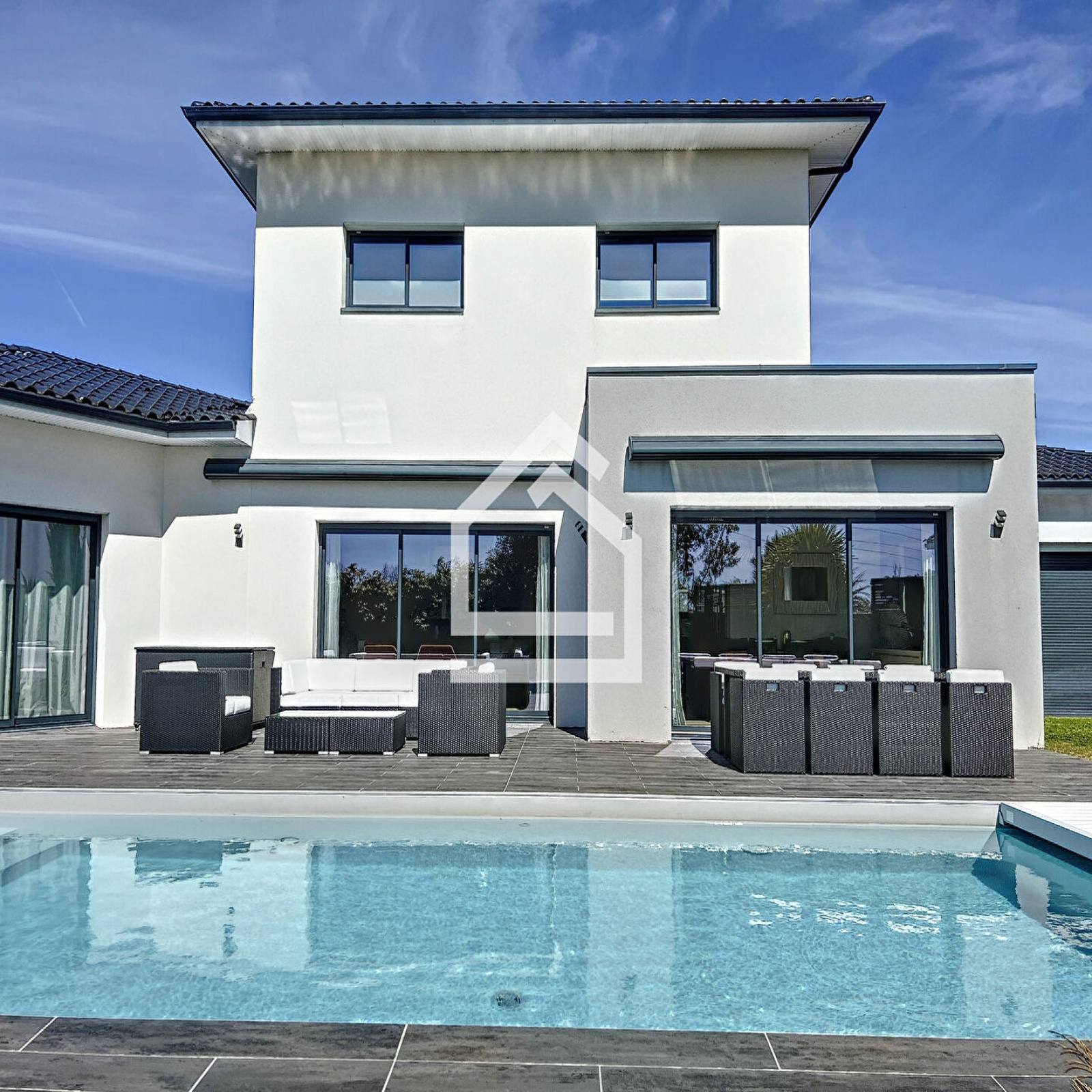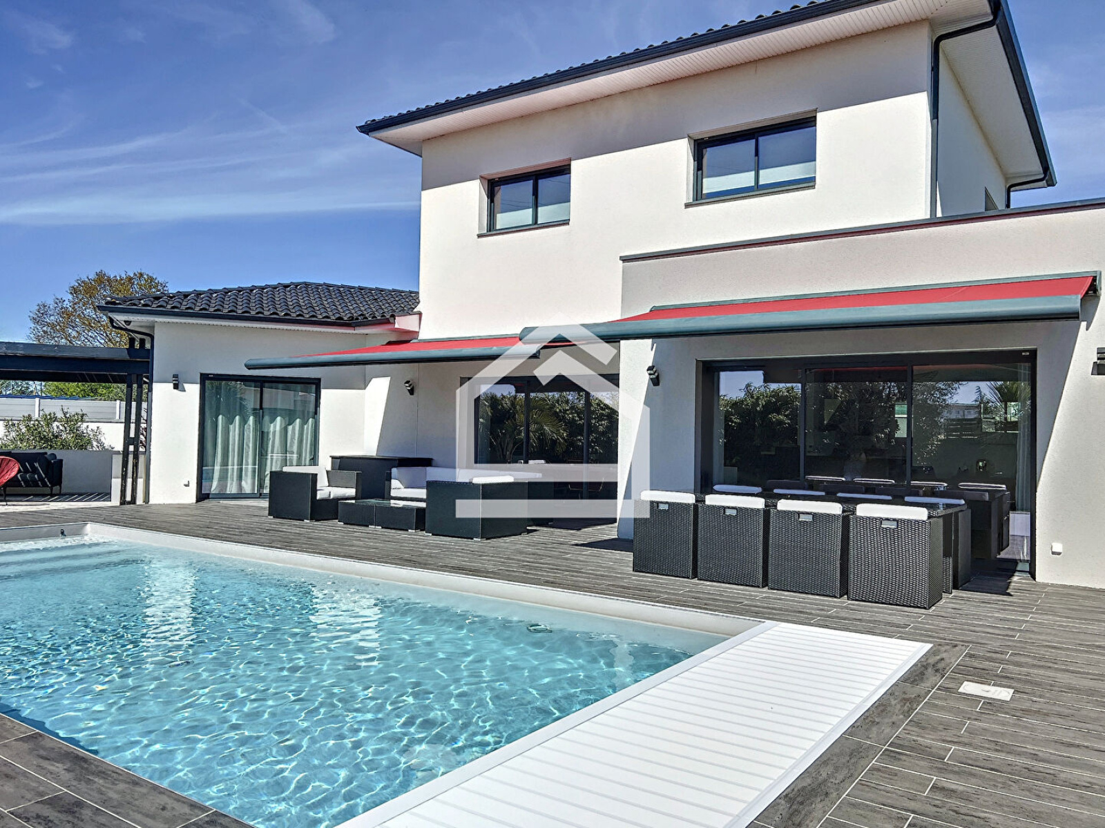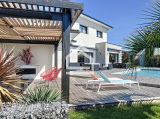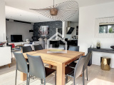 L'Agence Cadre d'Envies vous présente une magnifique villa d'environ 167 m2 construite en 2015 sur une parcelle d'environ 1037 m2. Proche des commodités, écoles et transports, l'emplacement est idéal pour faire toutes vos activités à pieds. La villa propose une spacieuse entrée avec des placards et un WC avec lave mains et fenêtre. Vous accéderez à la pièce de vie par une porte à galandage. Cet espace très lumineux se compose d'un salon, d'une salle à manger et d'une cuisine ouverte aménagée et équipée. Les volumes sont très agréables, et les prestations sont de qualité. Vous serez séduits par le parquet en chêne qui apporte du caractère et de la chaleur à cette villa contemporaine. De la cuisine, vous accédez à la buanderie et le cellier avec point d'eau et fenêtre pour ensuite arriver dans le garage qui dispose de nombreux placards. Au rez de chaussée, vous disposez également d'une grande suite parentale avec un spacieux dressing, une chambre avec vue sur la terrasse et la piscine, et une salle de bains avec baignoire, WC, douche, double vasque et fenêtre. A l'étage vous profiterez de trois chambres dont deux avec placards et une troisième idéale pour un bureau ou une chambre d'ami, d'un WC et d'une salle d'eau avec douche à l'italienne, double vasque et fenêtre. Les prestations sont de grande qualité et la villa est sécurisée. Le chauffage au sol à chaque niveau ainsi que la climatisation réversible vous apporteront un confort optimal tout en proposant des coûts énergétiques faibles. Le caractère irréprochable de cette villa vous permettra de vous y installer immédiatement. L'extérieur est agréable avec sa grande terrasse carrelée autour de la piscine 10 x 4 au sel, chauffée et sécurisée. Une deuxième terrasse en ipé permet de profiter de la pergola et de sa cheminée d'extérieur. Vous apprécierez également l'utilisation des stores bannes lors des grandes chaleurs. Le jardin paysagé est harmonieux et parfaitement conçu pour mettre en valeur l'esthétique tout en facilitant l'entretien. Vous bénéficiez également d'un deuxième garage avec de nombreux rangements. Cette villa est un bien rare sur le secteur. Honoraires vendeurs Les informations sur les risques auxquels ce bien est exposé sont disponibles sur demande ou sur le site Géorisques : www.georisques.gouv.fr Contact : Karine au 06.47.02.30.72