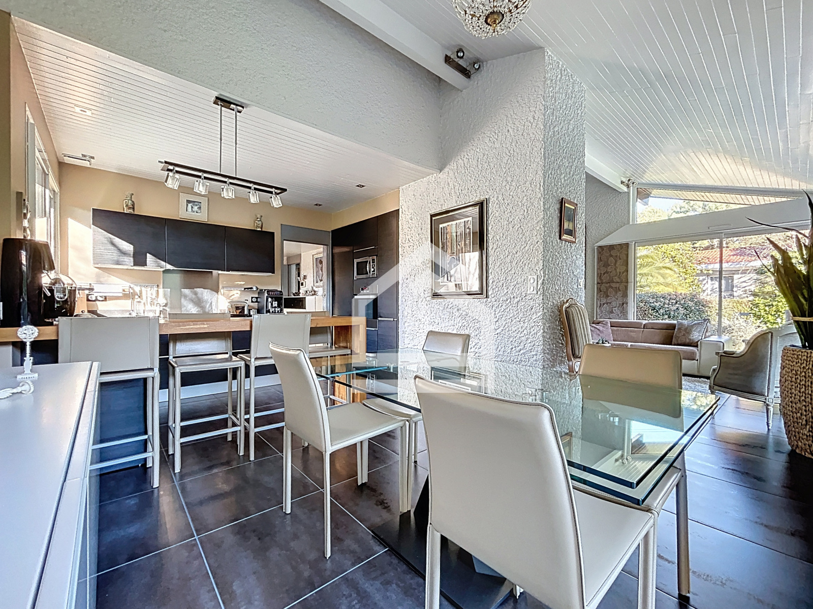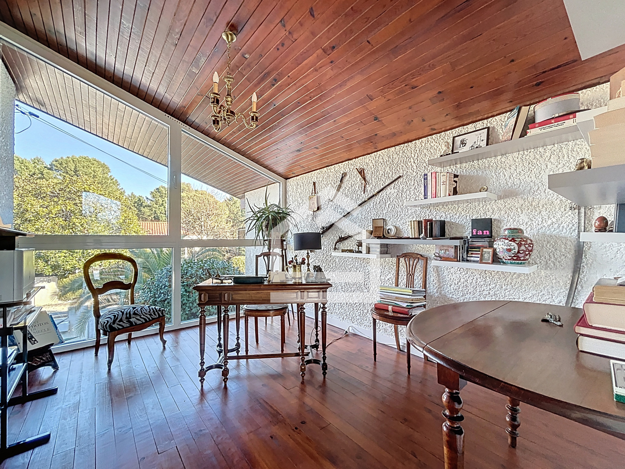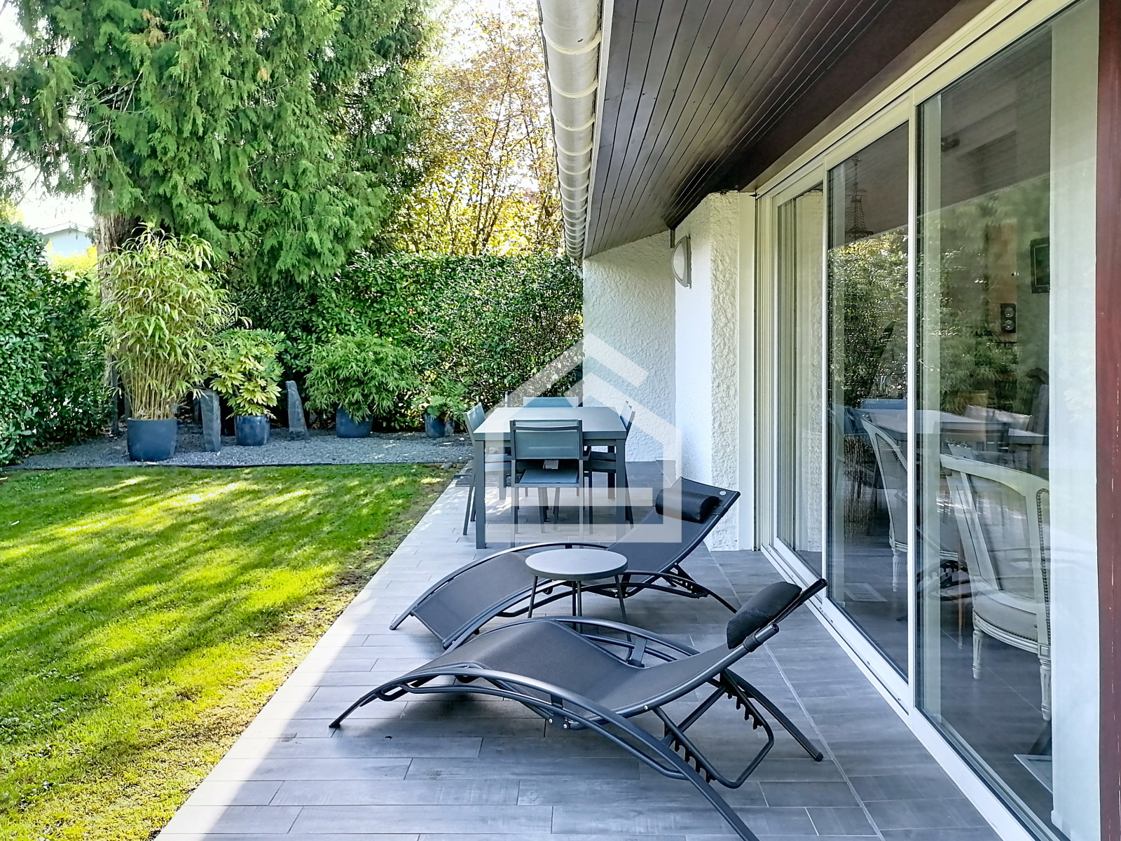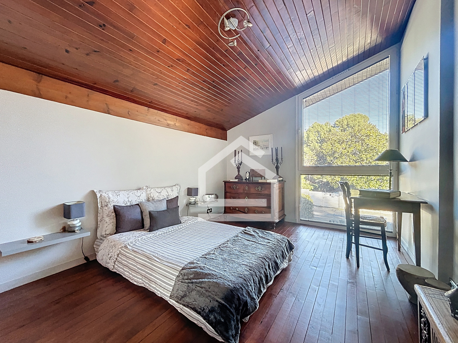 La pièce de vie, élégamment organisée autour d'une cheminée, bénéficie d'une belle luminosité et s'ouvre harmonieusement sur un jardin arboré, à l'abri des regards.