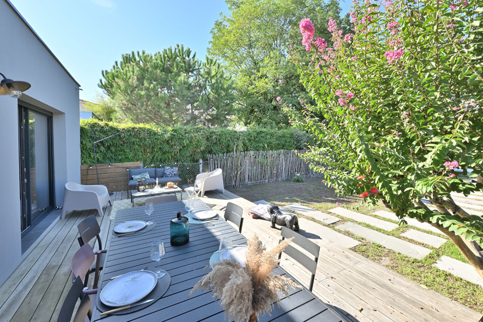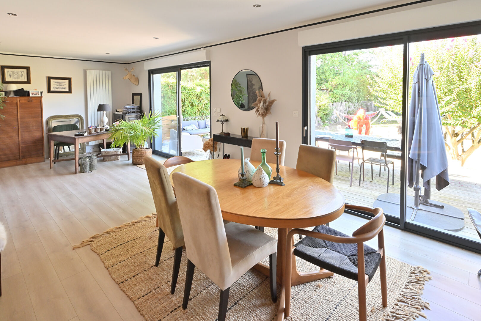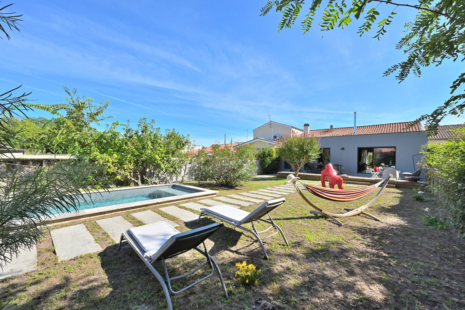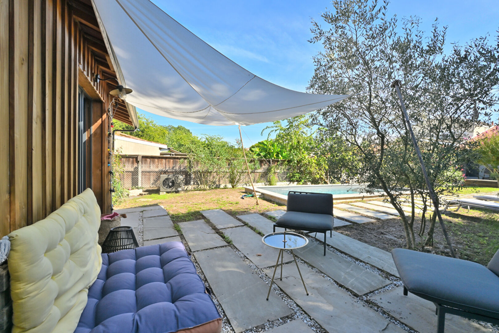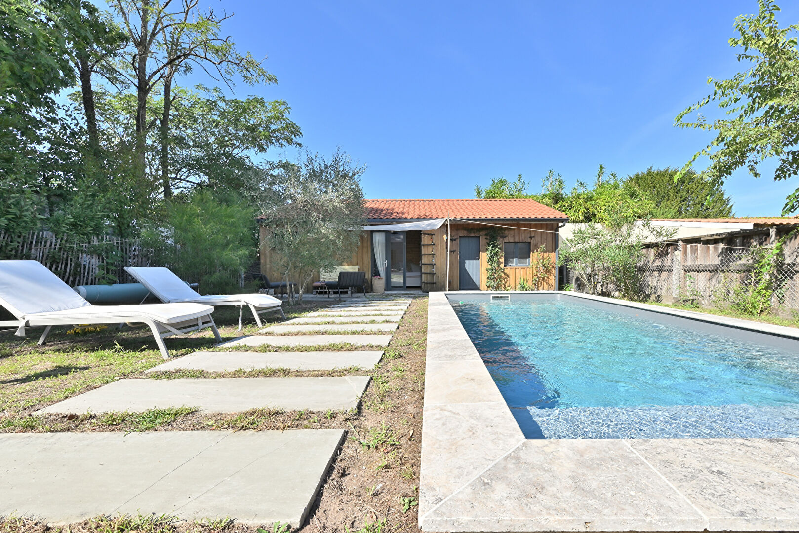 Entre Mérignac Arlac et Pessac Centre - Chaleureuse maison de plain-pied entièrement rénovée L'Agence Cadre d'Envies a le plaisir de vous présenter en exclusivité sur une parcelle arborée de 619 m2, sans vis-à-vis, une maison familiale d'environ 180 m2 habitables, répartis entre la demeure principale de plus de 150 m2 et une dépendance au style Ferret Capien d'environ 28 m2. Elle se situe dans une petite rue calme de Mérignac, entre Arlac et le quartier animé de Pessac Centre. Une fois le portail électrique passé, un joli jardin d'accueil vous permet de stationner en toute sécurité tous vos 2 roues ainsi qu'une voiture. Sur l'arrière, un vaste jardin paysagé vous attend pour profiter des longues journées d'été propices à la détente, aux sports aquatiques ou aux repas en famille. Plusieurs ambiances possibles selon les envies. Vous y trouverez une piscine au sel chauffée de 3 m x 7 m, une terrasse en bois et une dépendance comprenant une chambre avec salle d'eau et le local piscine avec rangements. La maison, de plain-pied et récemment rénovée avec goût, offre un généreux espace à vivre de plus de 65 m2 comprenant un salon/salle à manger avec poêle à bois et espace bureau et une cuisine ouverte équipée. Le tout donnant sur la terrasse et le jardin par de larges baies vitrées en alu. Côté nuit, vous trouverez 3 grandes chambres, 2 salles d'eau dont une privative, un très pratique cellier/buanderie et un grenier. Proximité des écoles, des commerces et de nombreux transports en commun. Gares TER de Mérignac Arlac ou de Pessac et Tram B arrêt Pessac Centre. Lignes de Bus 74 et 78. Le bois du Burck est à quelques minutes. Maison très séduisante de par son environnement et la richesse de ses prestations. Le prix est de 756 000€ honoraires d'agence inclus, charge acquéreur, soit 5% TTC. Prix hors honoraires : 720 000€. Pour plus de renseignements, merci de contacter Sylvain Jérémiasz au 06 28 60 08 59. Les informations sur les risques auxquels ce bien est exposé sont disponibles sur demande ou sur le site Géorisques : www.georisques.gouv.fr