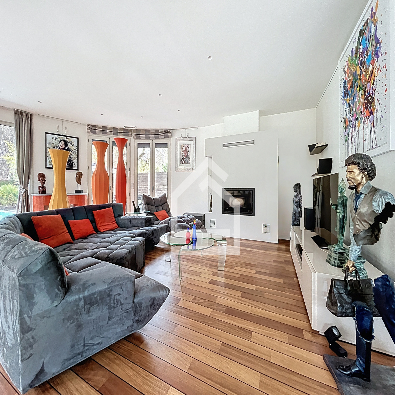 À l’extérieur, le jardin paysager, entièrement à l’abri des regards, constitue un véritable écrin de verdure. La grande piscine s’inscrit naturellement dans cet environnement apaisant, tandis qu’une cuisine d’été parfaitement aménagée prolonge les espaces de vie et promet de beaux moments de partage lors des journées ensoleillées.