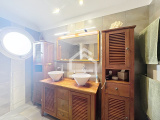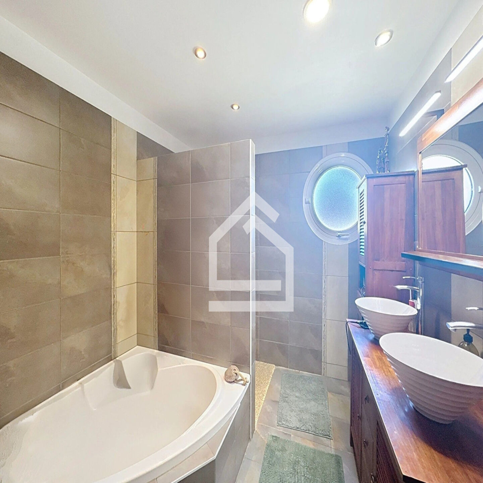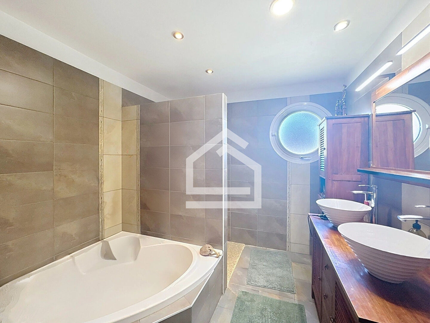 La salle de bains, élégante et bien pensée, est équipée d'une baignoire, d'une douche et d'un meuble double vasque. Un second WC indépendant complète cet espace.