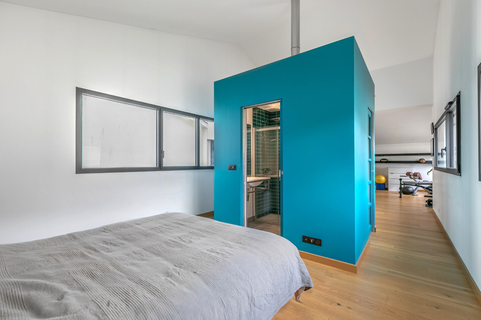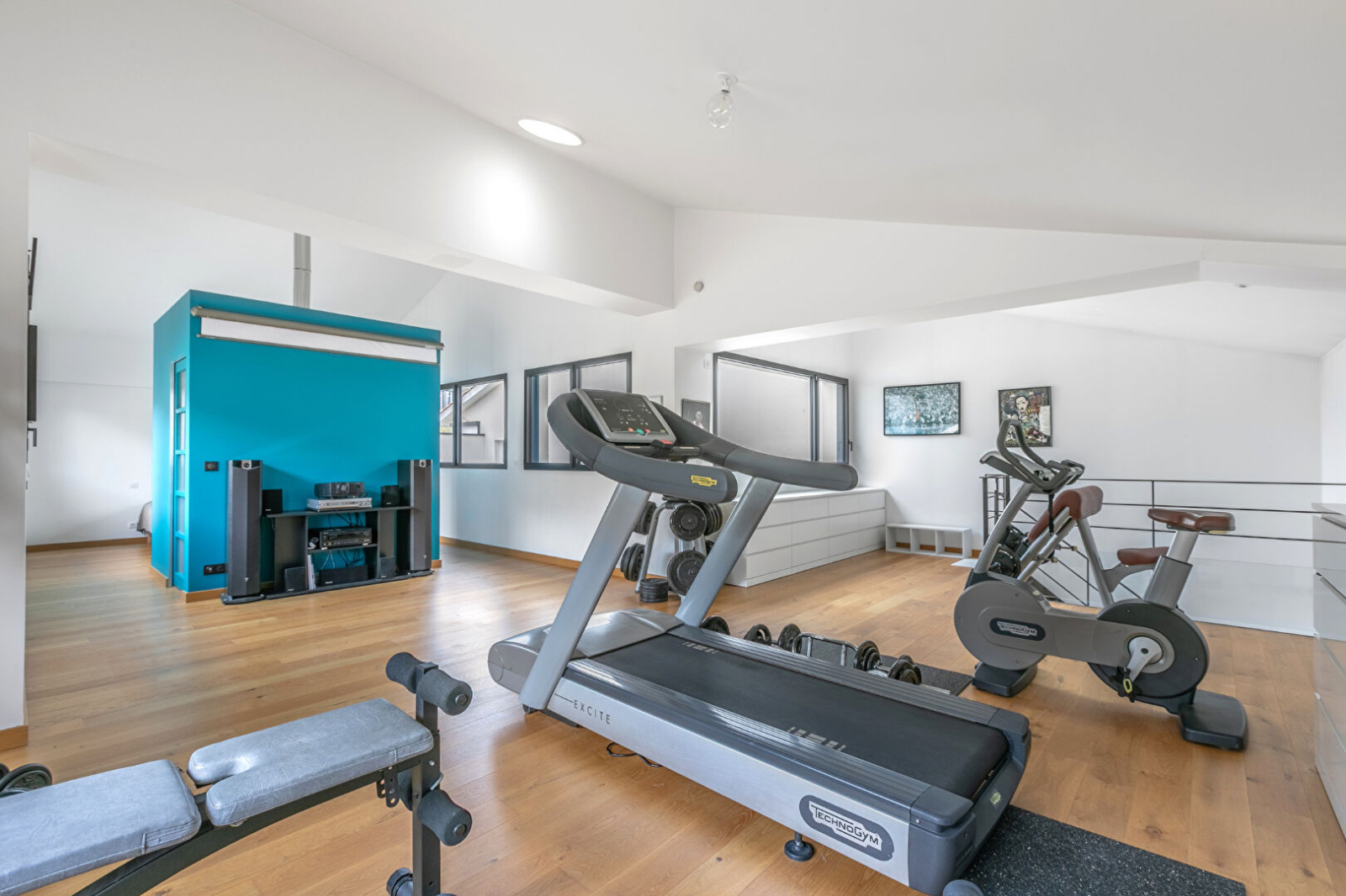 Enfin, le deuxième et dernier étage accueille une troisième chambre de 25 m2, une salle d'eau, des toilettes séparées et un spectaculaire volume utilisé aujourd'hui en salle de sport et salle de cinéma, à aménager en fonction de vos envies.
