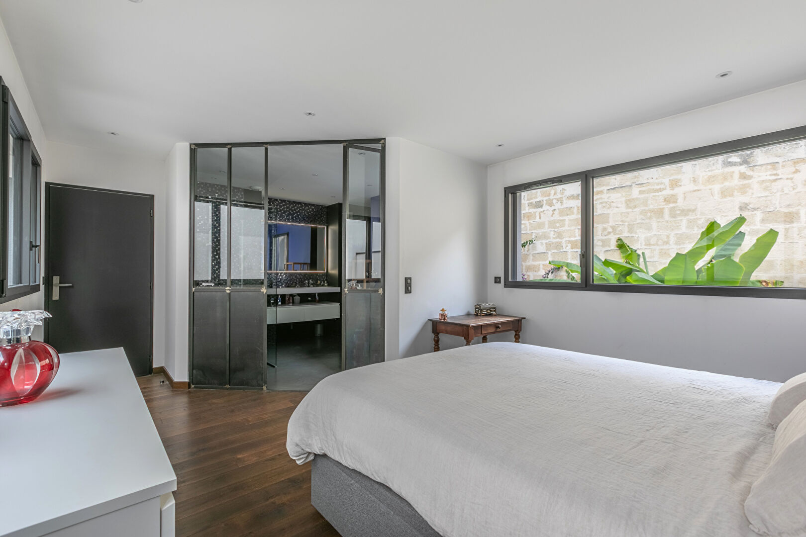Ensuite, un élégant escalier en acier et verre dessert le premier étage. Vous y découvrirez une suite parentale complète de 32 m2 avec son dressing et sa salle de bain avec douche italienne et toilettes, et une deuxième chambre de 21 m2 disposant de sa salle d'eau et de toilettes.