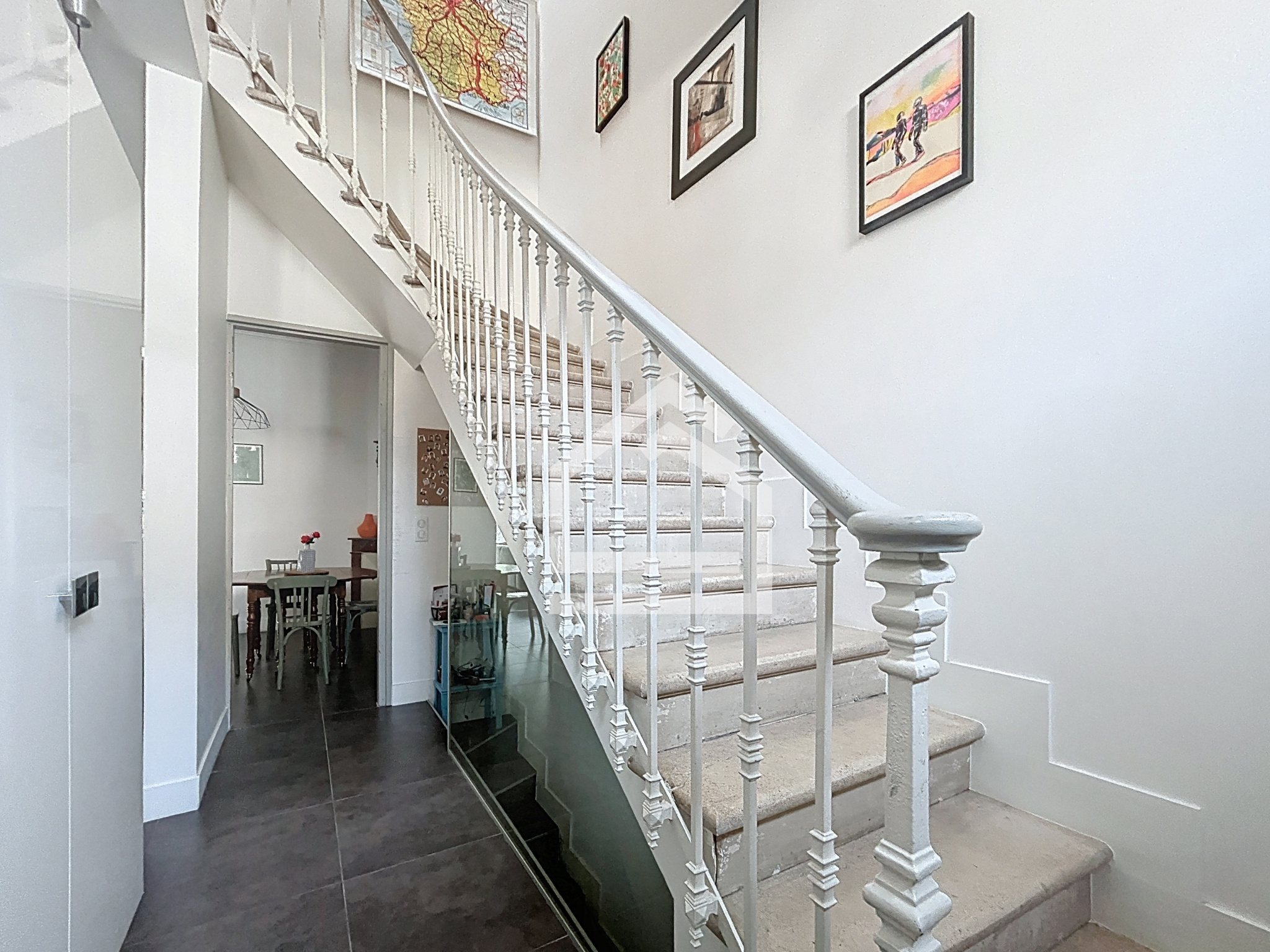 Dès l’entrée, le charme opère avec un superbe escalier en pierre qui structure la maison.