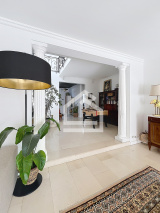 A l'intérieur, l’espace de réception, composé du salon, de la salle à manger et du dégagement menant à l’escalier, développe déjà près de 68 m² et bénéficie de volumes particulièrement généreux. La configuration actuelle permet également d’envisager l’ouverture de la cuisine sur cet ensemble, offrant ainsi la possibilité de créer une exceptionnelle pièce de vie d’environ 85 m², un véritable espace de réception baigné de lumière.