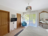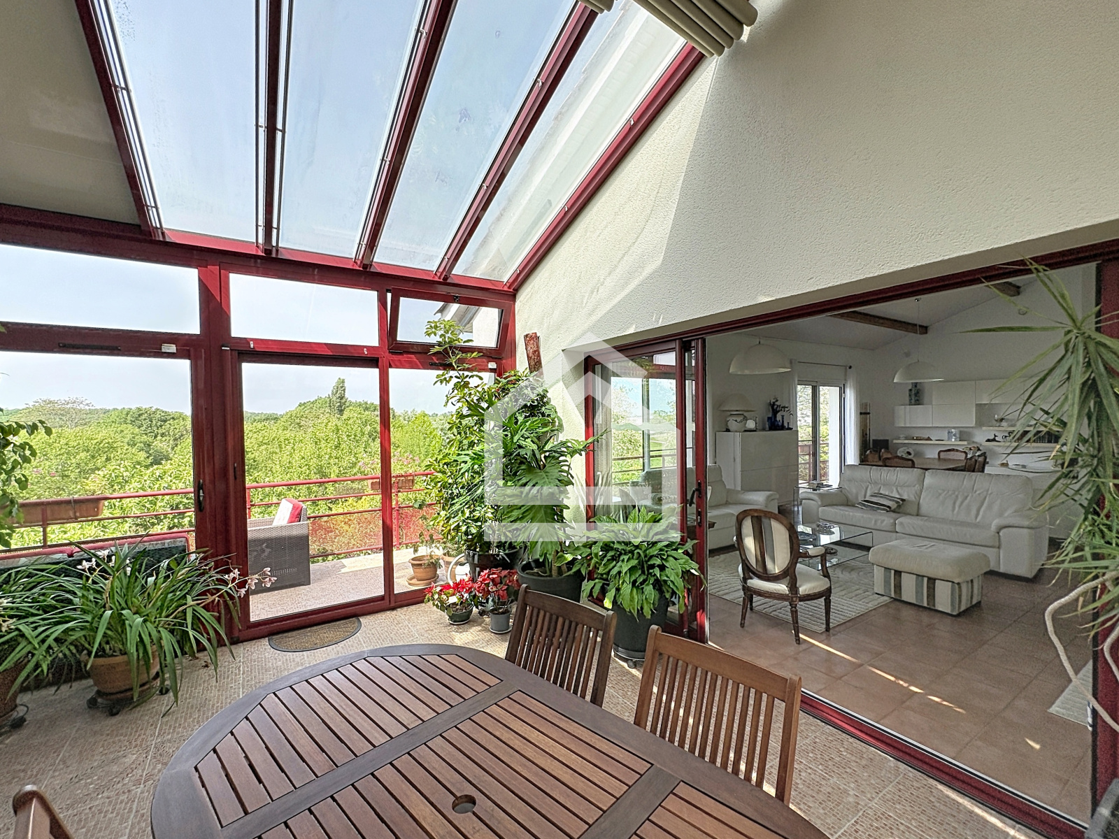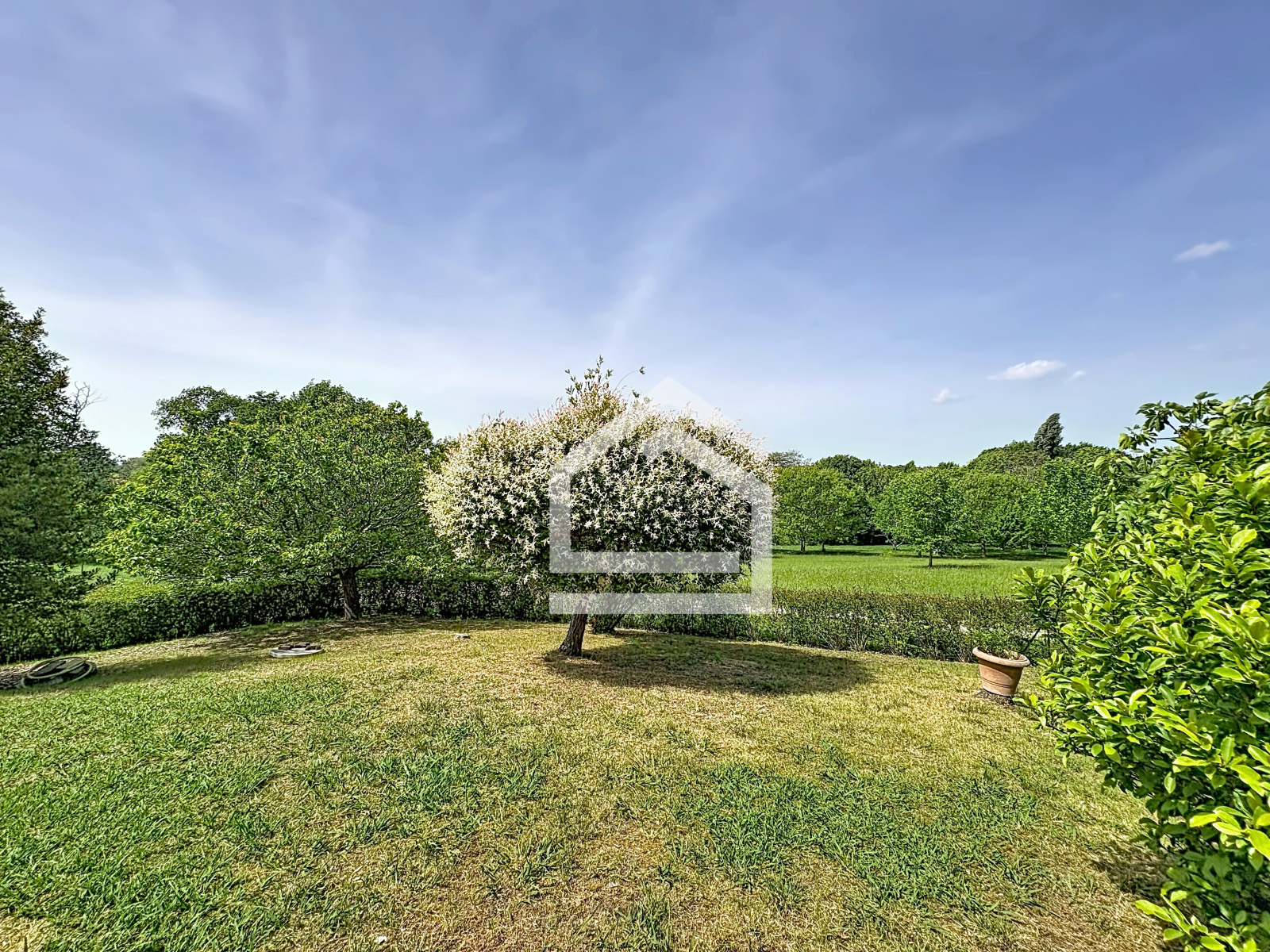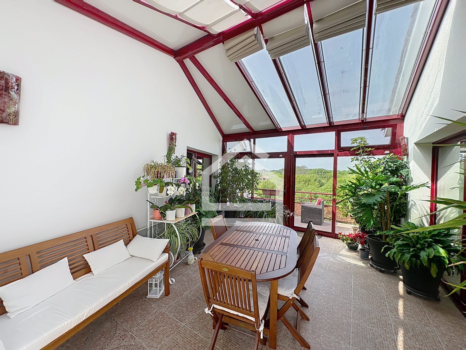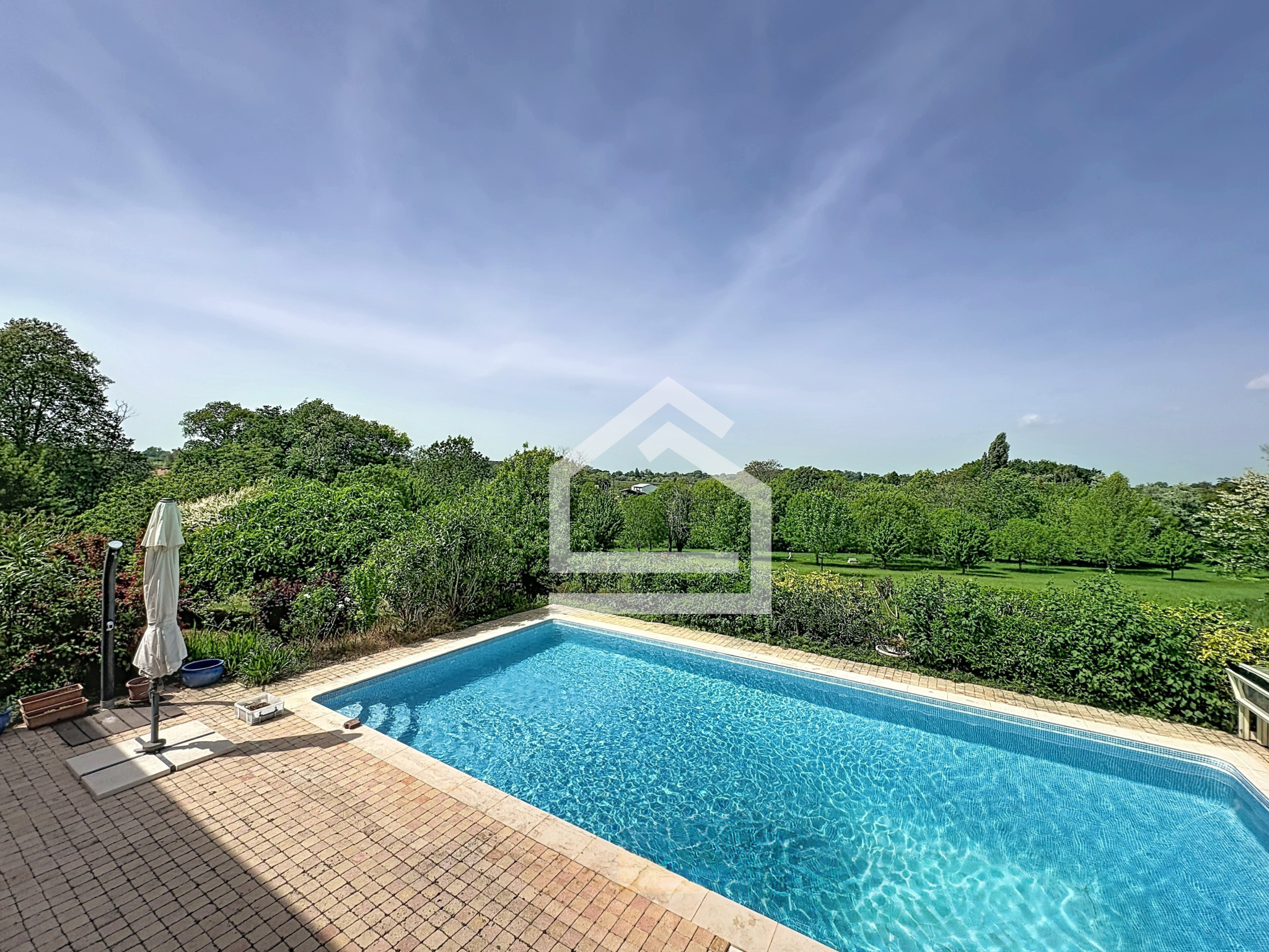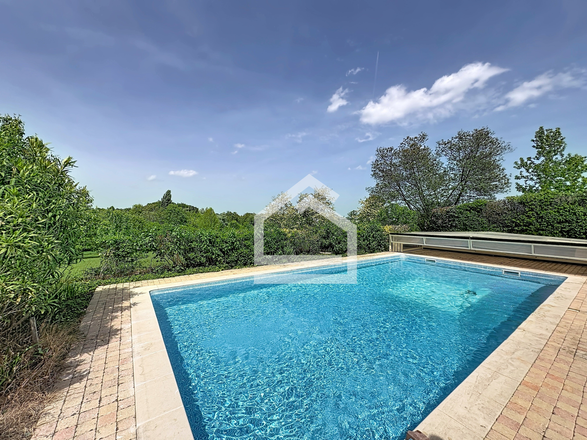 À l’extérieur, la maison s’ouvre sur un jardin arboré et très bien entretenu, où se déploient une vaste terrasse d’environ 60 m² et un balcon-terrasse d’environ 20 m². Ces espaces offrent différents points de vue sur le jardin et la piscine 5 × 10 m, protégée par un abri amovible. Un garage de 20 m² complète l’ensemble.