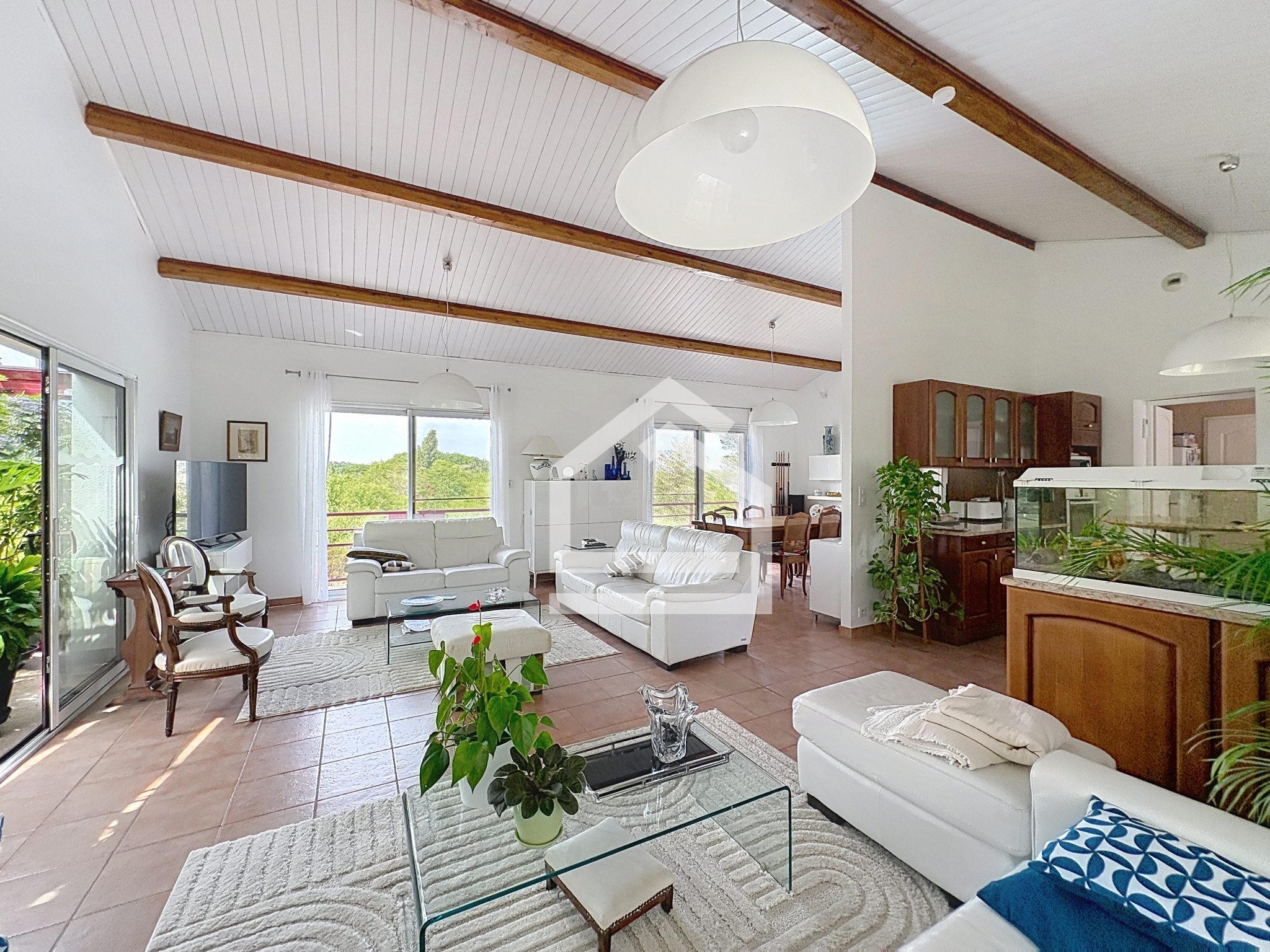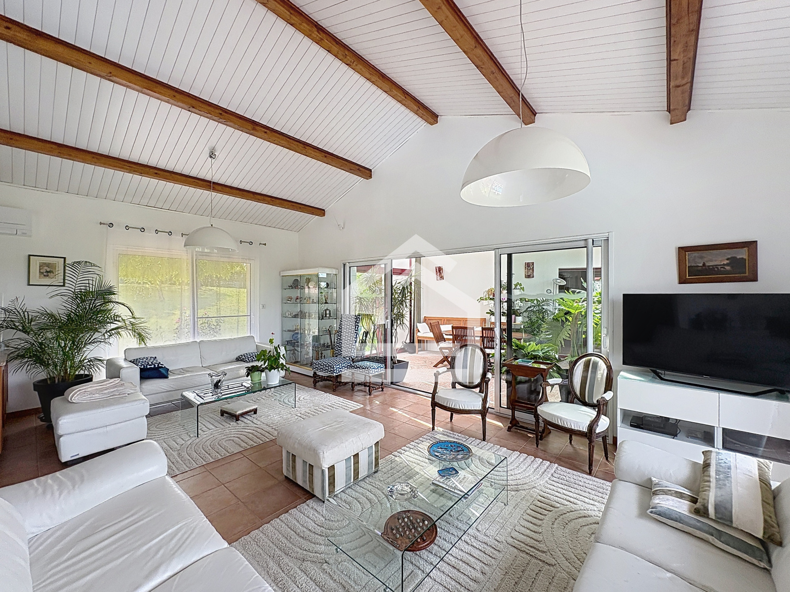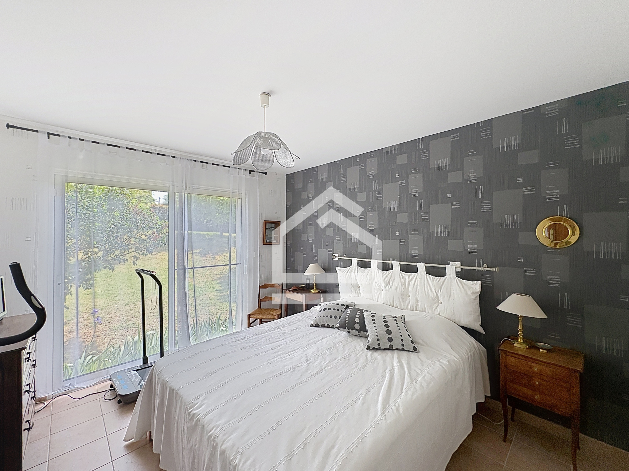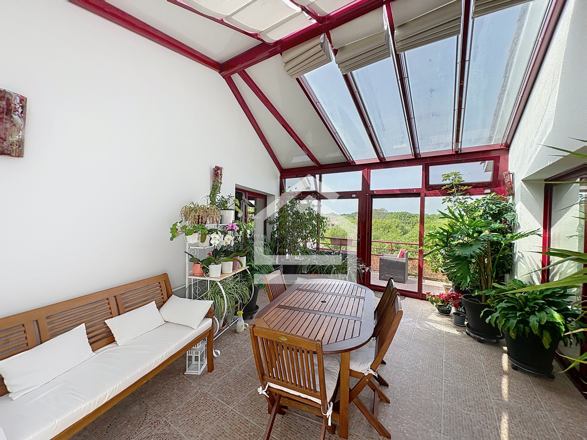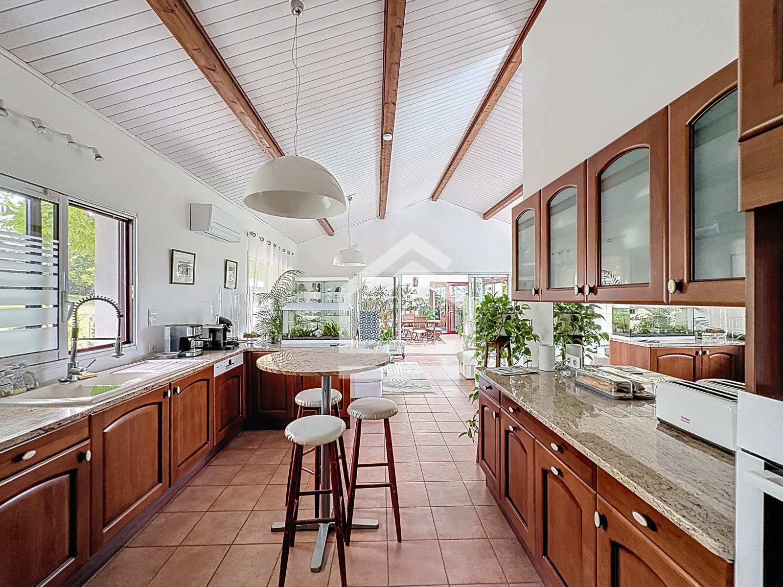 La pièce de vie de 54 m², lumineuse et traversante, se prolonge par une véranda baignée de lumière, véritable espace de vie supplémentaire. La cuisine ouverte aménagée et équipée est complétée par une buanderie et un cellier attenants.