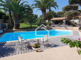 Les extérieurs invitent à la détente : deux grandes terrasses ombragées de stores-bannes bordent la piscine (11,5 x 5 m) équipée d'un système de nage à contre-courant. Le jardin paysager, soigneusement entretenu et planté de belles espèces de palmiers, crée une ambiance apaisante et élégante. Une véranda aménagée en jardin d'hiver, avec un parquet type pont de bateau, offre une transition entre intérieur et extérieur.