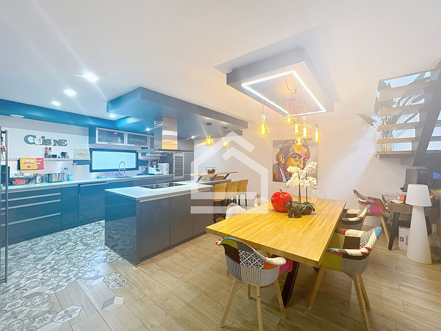 Le salon, la salle à manger et la cuisine ouverte profitent d'une hauteur cathédrale sublimée par une charpente traditionnelle apparente. Vous traversez un patio aménagé, véritable havre de paix avec sa terrasse en bois exotique et sa piscine au sel chauffée : un espace intime, rare et parfaitement intégré à la maison.