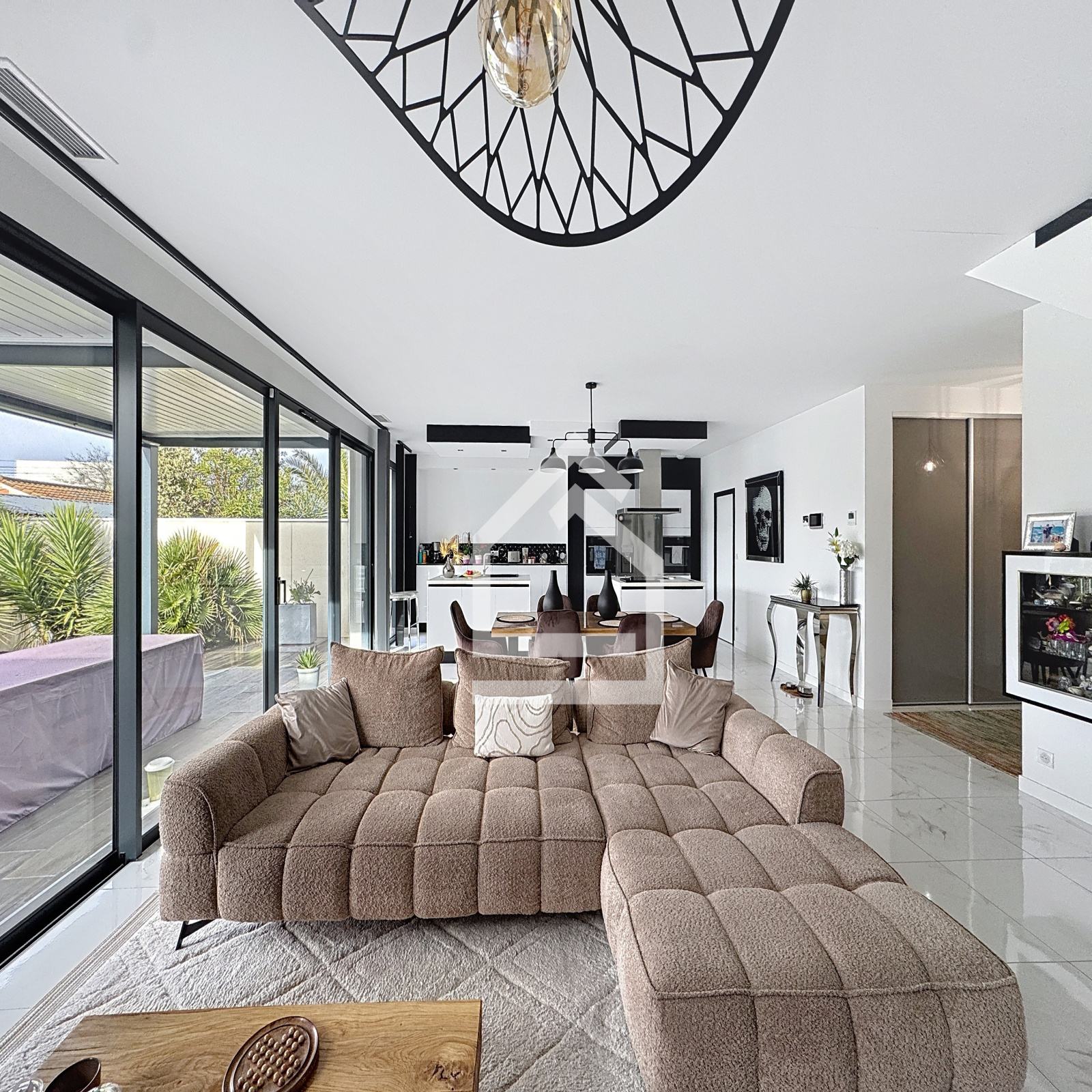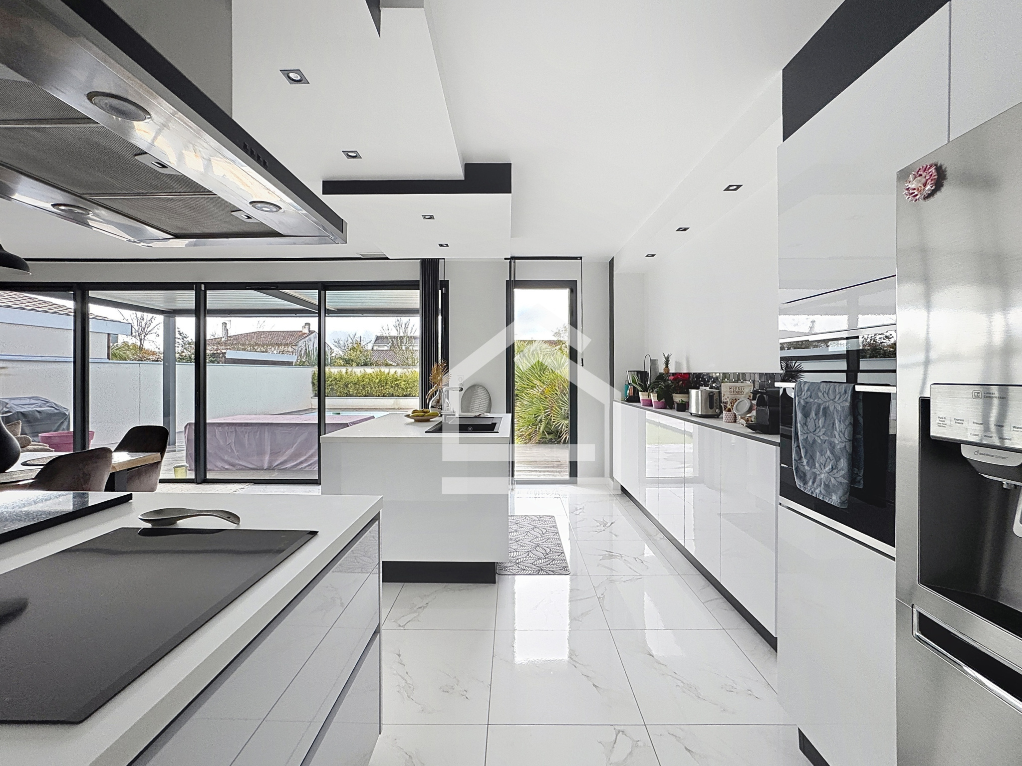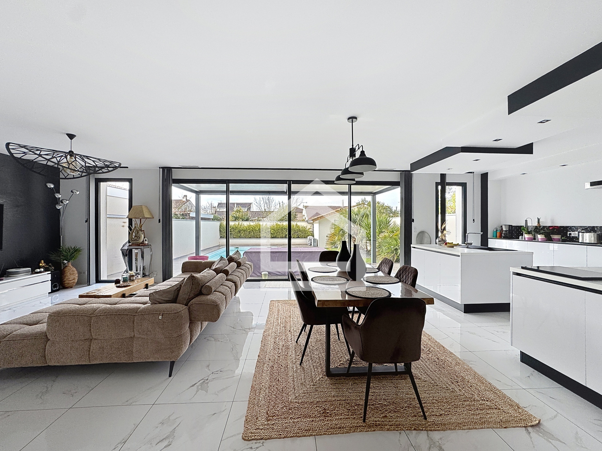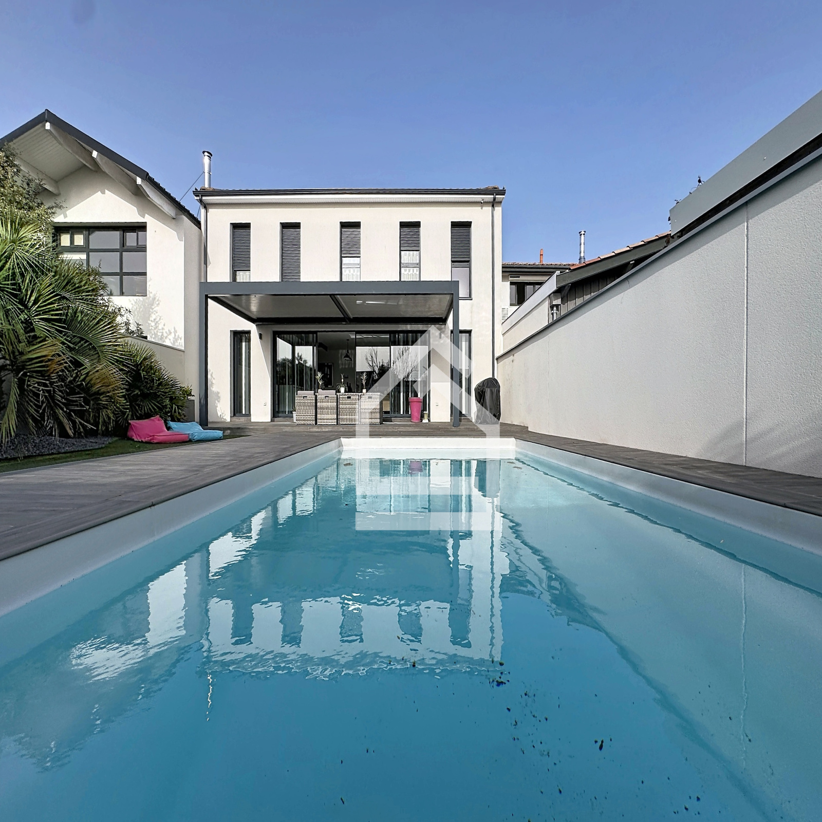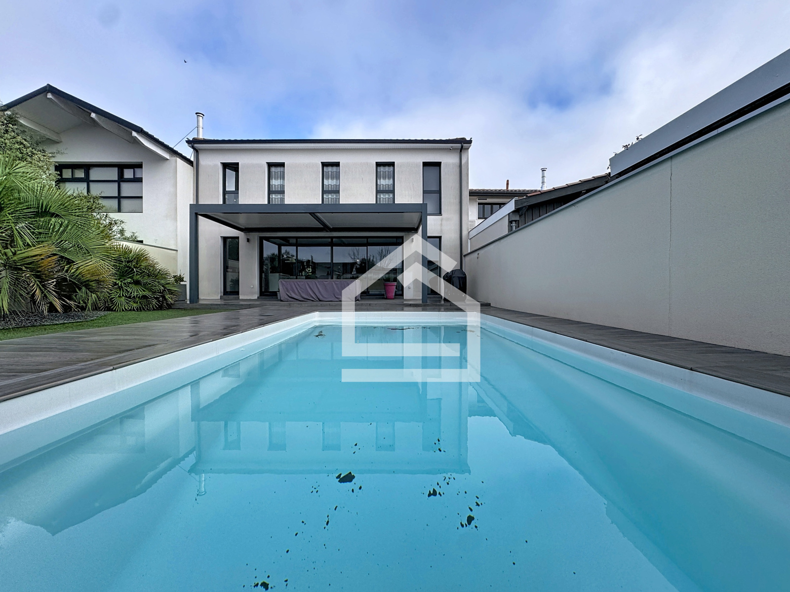 L'extérieur comprend un jardin d'accueil, avec portail électrique, ainsi qu'un jardin exposé sud, avec terrasse, pergola bio climatique, et piscine chauffée (8 m X 4 m). Pas de vis à vis.