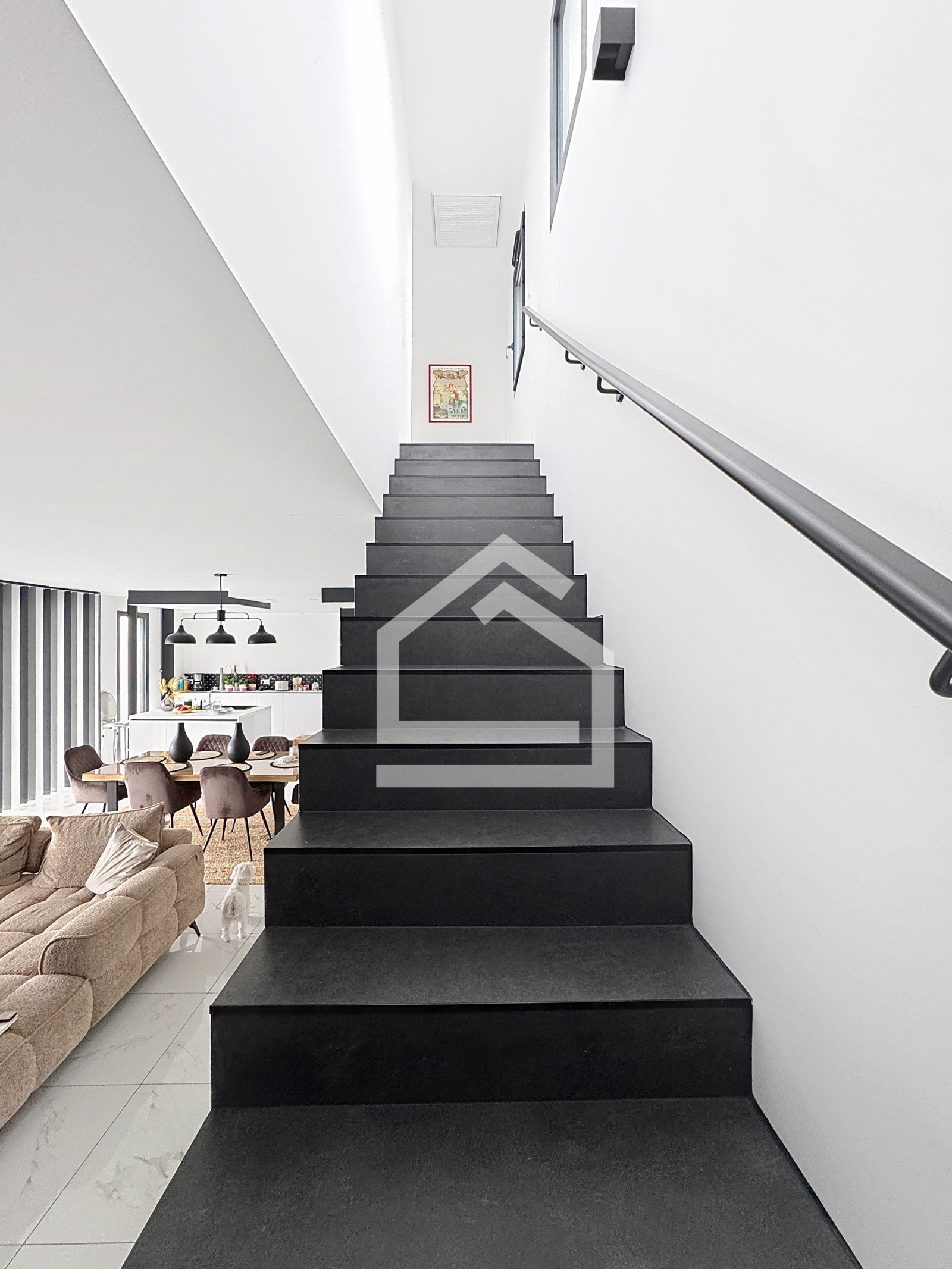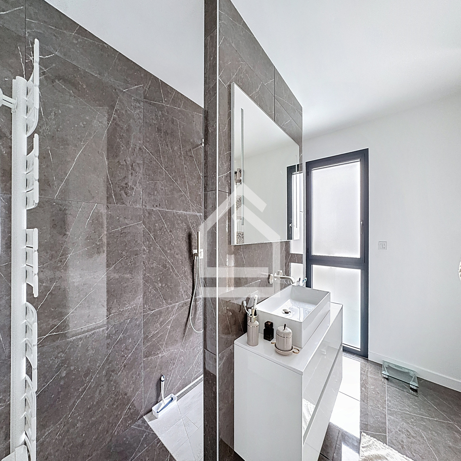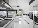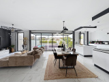 Le rez de chaussée s'ouvre sur une belle pièce de vie lumineuse de 62 m², exposée sud. La cuisine moderne et équipée est ouverte sur le salon. Ce niveau comprend également une chambre avec salle d'eau, une buanderie, un WC séparé et un garage de 21 m² avec volet roulant électrique.