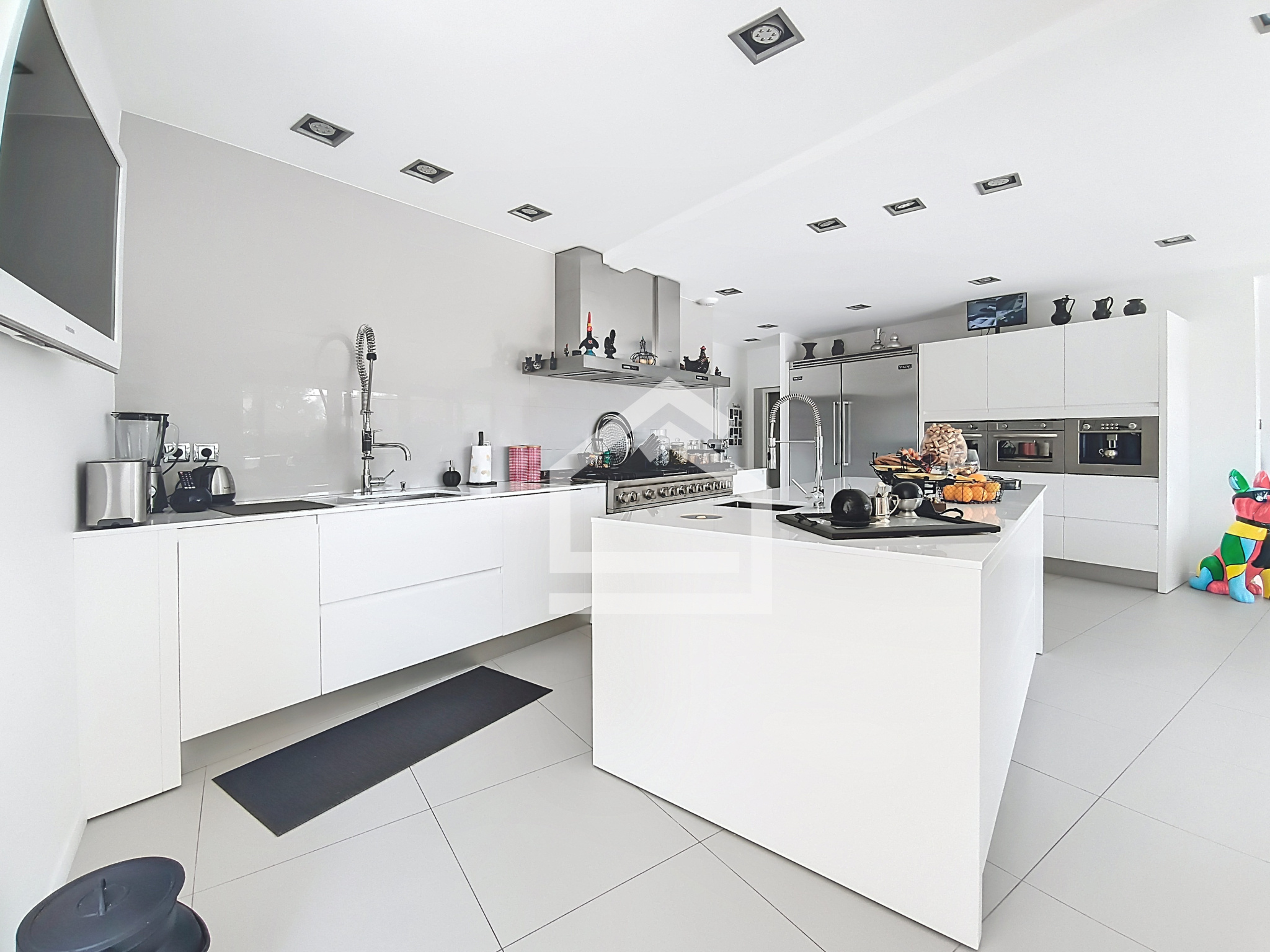 La cuisine, véritable pièce de signature, s’impose comme un espace à vivre à part entière. Entièrement équipée en électroménager professionnel, elle dialogue avec une élégante salle à manger habillée de larges dalles de quartz, dans une harmonie de matières sobres et intemporelles.
