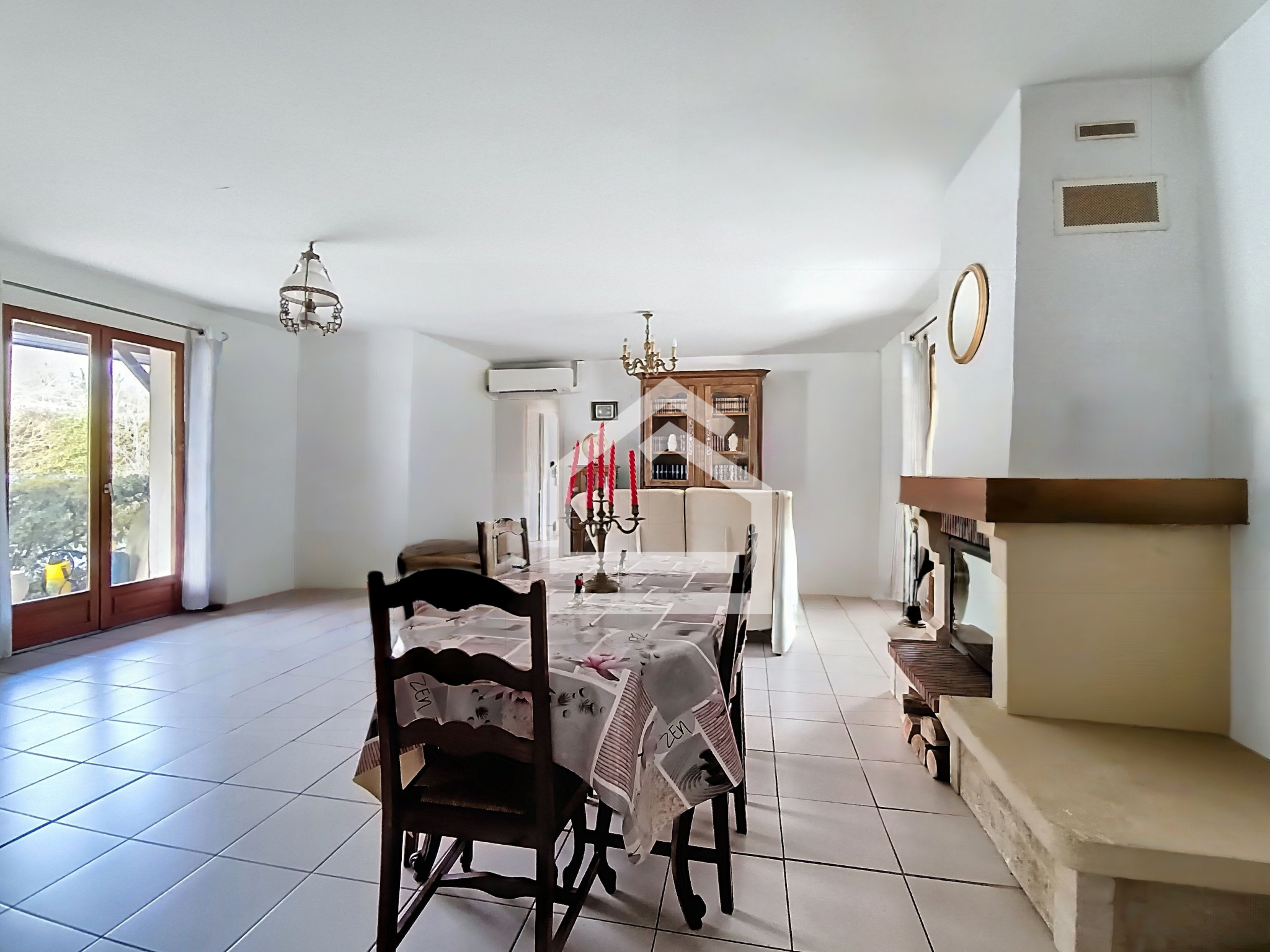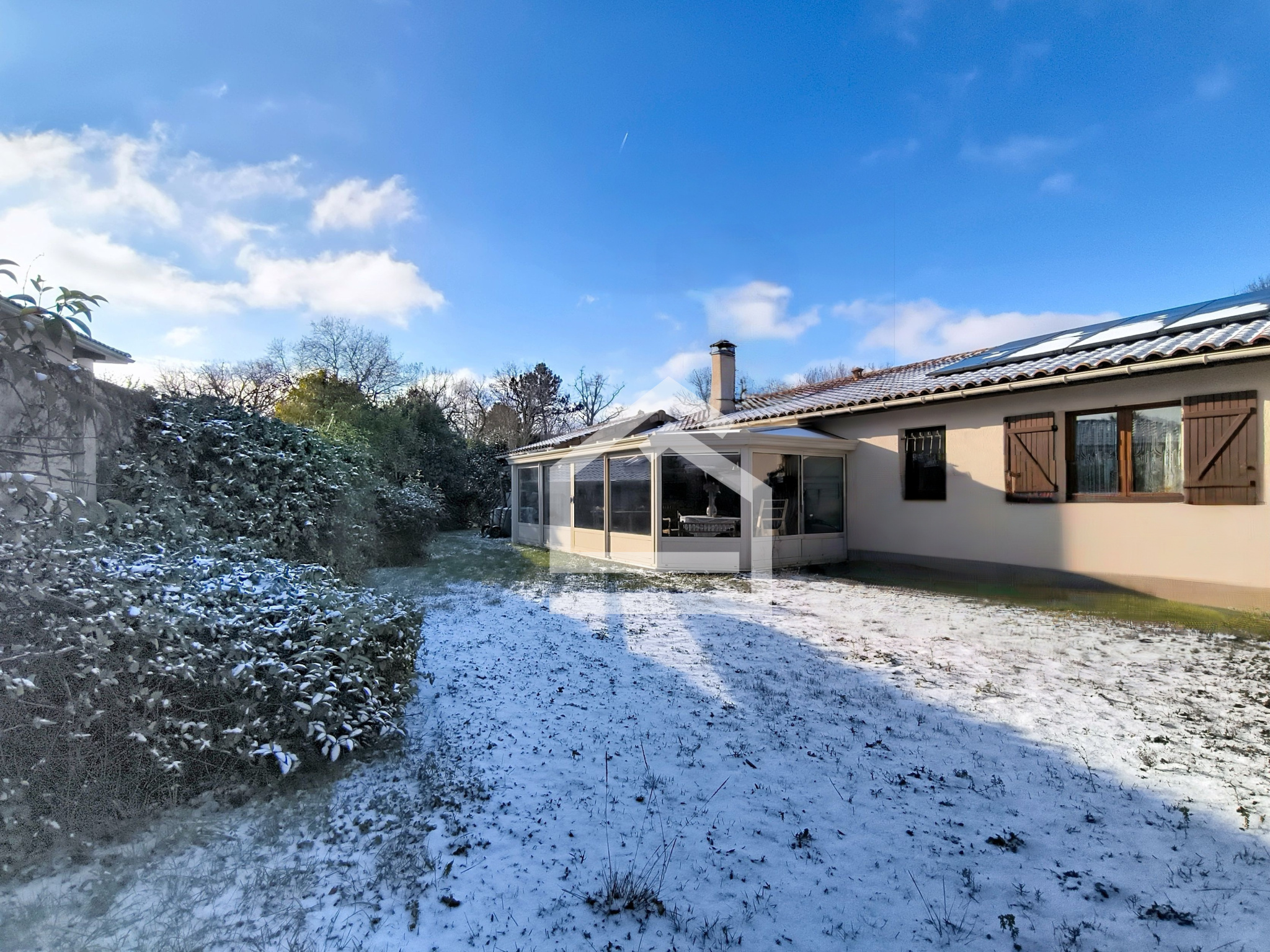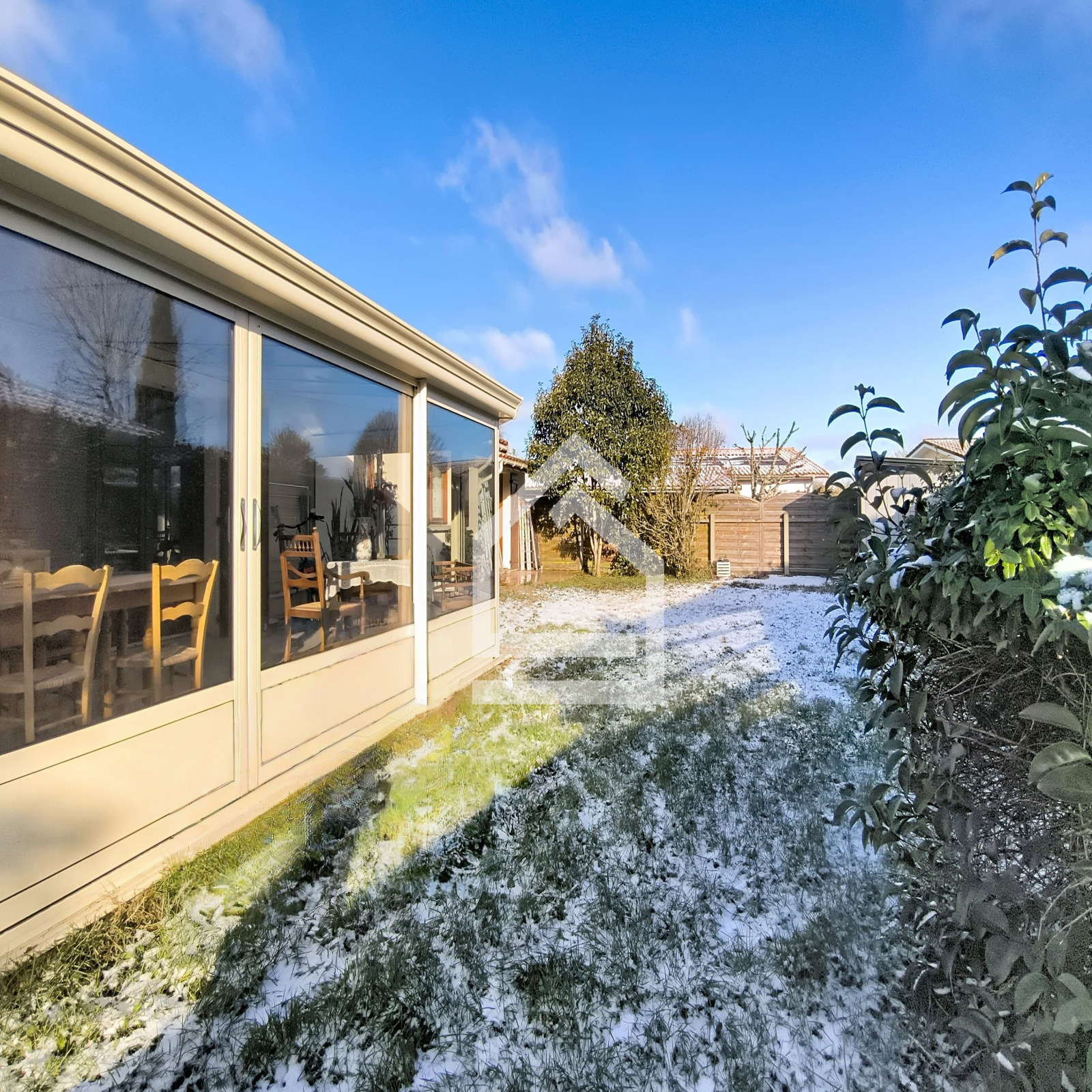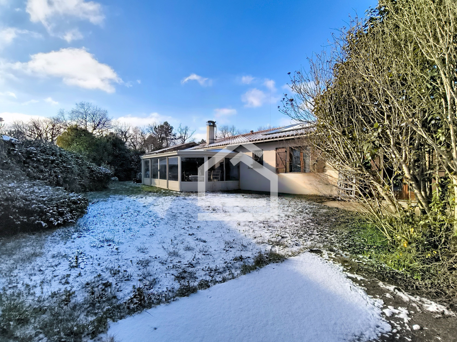 La maison se compose d'une entrée accueillante, d'une belle pièce de vie traversante et lumineuse avec cheminée, d'une cuisine aménagée et équipée s'ouvrant sur la véranda de 23m², véritable espace de transition vers le jardin.