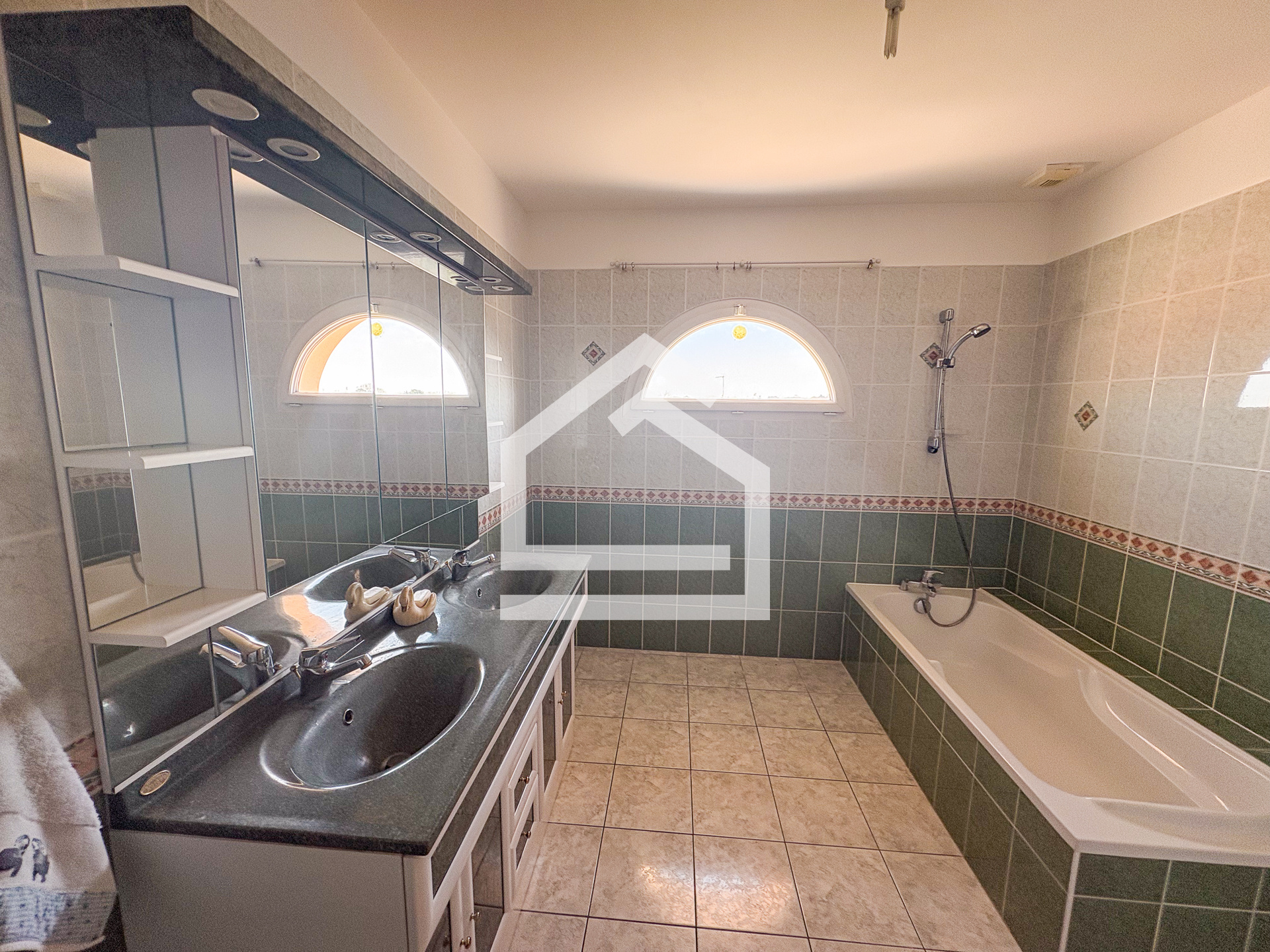 À l'étage, trois chambres spacieuses, chacune dotée d'un placard, se partagent une salle de bain à double vasques et baignoire avec branchements indépendants pour lave-linge et sèche-linge — un confort rare et très apprécié. Des toilettes séparés, un placard de palier.
