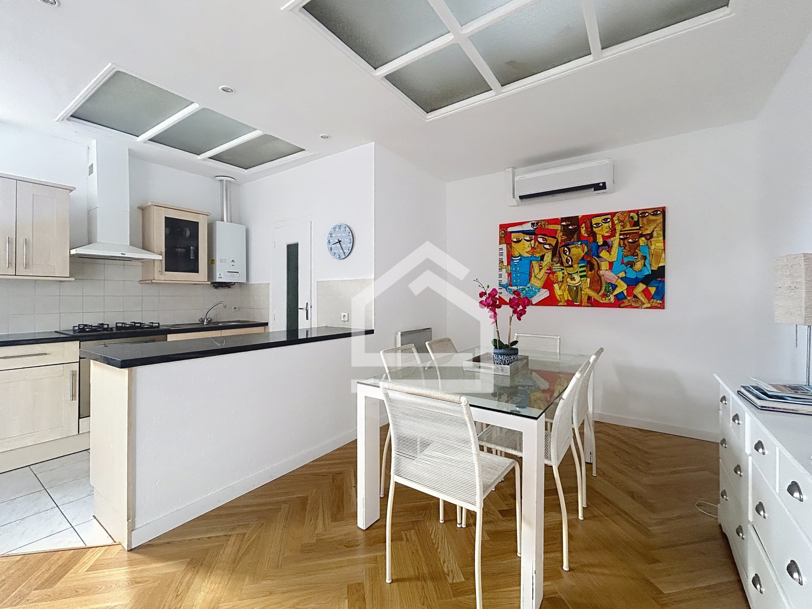 Rénové avec goût il y a deux ans, le logement offre une belle pièce de vie traversante Est / Ouest, baignée de lumière. La porte-fenêtre exposée Ouest s’ouvre sur la cour intérieure, garantissant à la fois luminosité et tranquillité.
